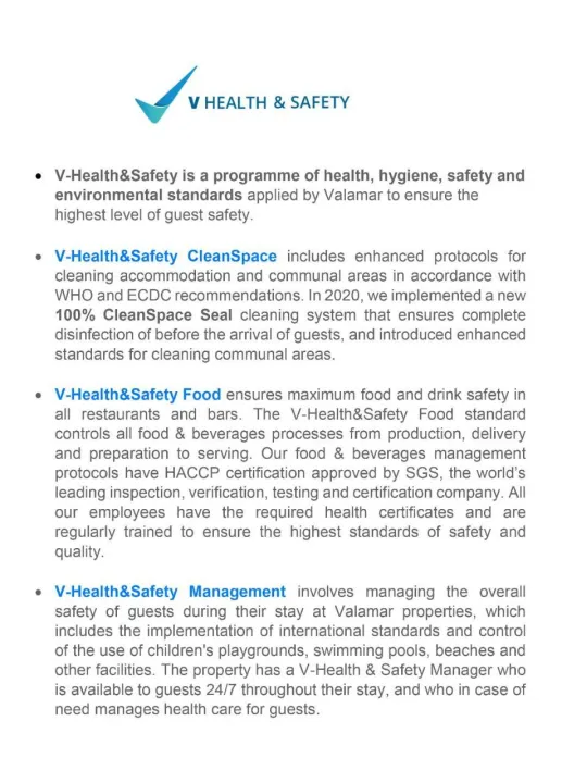 Kompleks bazena osigurava udobno plivanje sa prijatno zagrejanom vodom i 2 otvorena i zatvorena bazena. Deca mogu da uživaju u posebnom delu bazena samo za njih. Gosti mogu sebi priuštiti osvežavajuće napitke u baru pored bazena i opuštajuće kupanje u đakuziju (uz doplatu). Na raspolaganju su sunčana terasa, ležaljke i suncobrani. Hotel nudi sveobuhvatan sportski program, uključujući odbojku. Gosti takođe mogu uživati u vožnji biciklom / planinskim biciklom, tenisu, odbojci na plaži, košarci i ludom golfu. Dostupni su brojni sportovi, uključujući vodene sportove poput surfovanja na dasci, kajaka, vodene gimnastike i aquafit-a. Gosti takođe mogu uživati u vožnji motornim čamcem, vožnji pedalina, vožnji banane, ronjenju i ronjenju (uz doplatu). Širok spektar unutrašnjih sportskih aktivnosti takođe se nude, na primer kalicstetika i aerobik ili, uz doplatu, teretana, stoni tenis i rukomet. Postoji wellness zona sa spa centrom, hamamom, salonom lepote, tretmanima protiv starenja i solarijumom i, uz doplatu, saunom, parnim kupatilom i tretmanima masaže. Dodatne aktivnosti u slobodno vreme uključuju zabavni program, dečiji klub, dečiji disko i živu muziku.