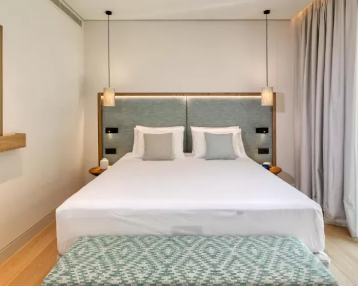 deluxe junior suite pogled more 34m2, maksimum 2 osobe: Soba ima francuski bračni krevet (udoban Simmons dušek). Sa neverovatnim, opuštajućim pogledom na Egejsko more, ove sobe nude sve udobnosti i usluge, kao i poseban radni prostor, kao i veliki balkon/terasu sa udobnim nameštajem. Mermerno kupatilo sa kišnim tušem sa kojeg se pruža pogled na more.