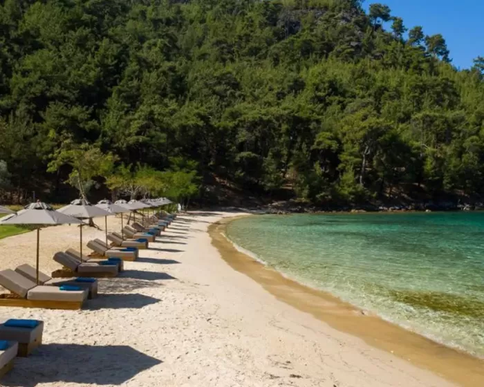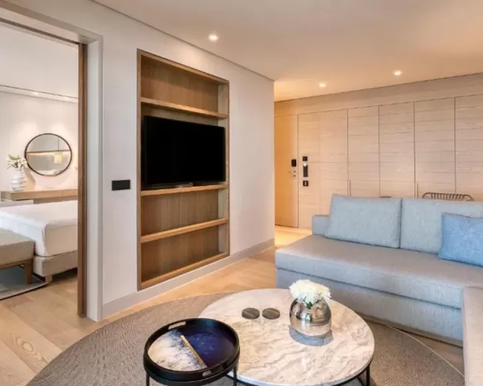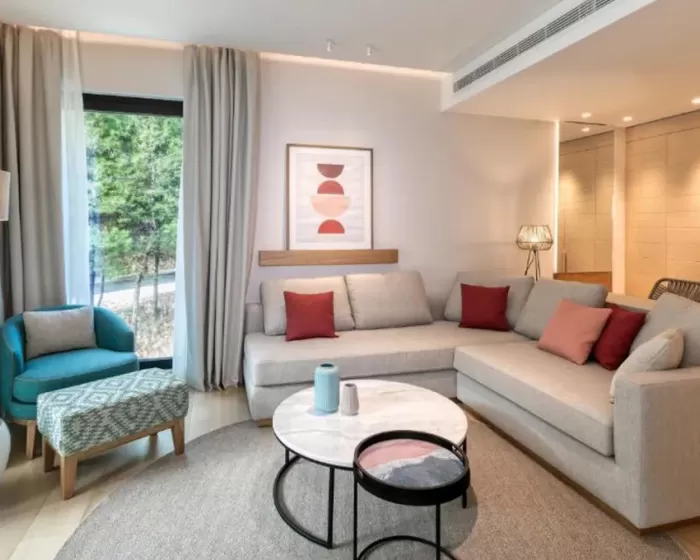 deluxe family suite pogled more 67m2, maksimum 5 osoba: Apartman sa 2 spavaće sobe, svaka soba ima francuski bračni krevet (udoban Simmons dušek). Ovaj prefinjeni, luksuzni dvosobni apartman sa udobnim dnevnim boravkom, koji je odvojen od glavne spavaće sobe, garantuje trenutke apsolutnog opuštanja. Sa neverovatnim pogledom na Egejsko more sa jedne strane i borovu šumu sa druge, ove porodične sobe nude sve pogodnosti i usluge, kao i balkon/terasu. Mermerno kupatilo sa kišnim tušem.