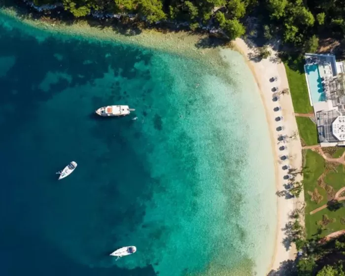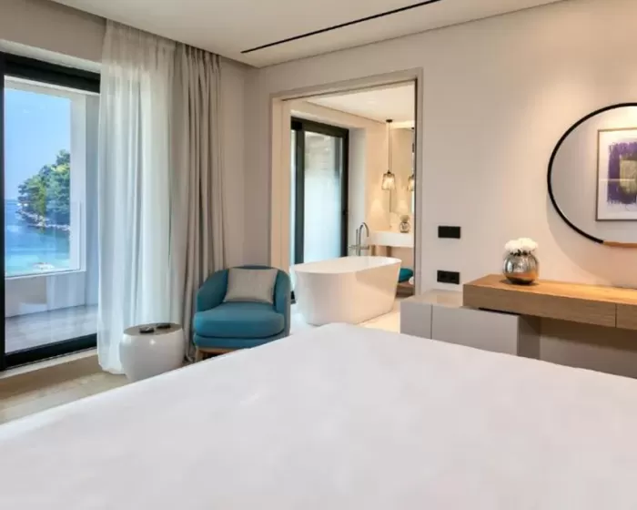 deluxe corner suite pogled bašta more 45m2, maksimum 3 osobe: Soba ima francuski ležaj (udoban Simmons dušek). Ovaj prefinjeni, luksuzni jednosobni apartman sa udobnim dnevnim boravkom, koji je odvojen od glavne spavaće sobe, garantuje trenutke apsolutnog opuštanja. Sa prekrasnim pogledom na borovu šumu i bočnim pogledom na more uvale Vati, ima prostran balkon i sopstveno mermerno kupatilo sa kišnim tušem.