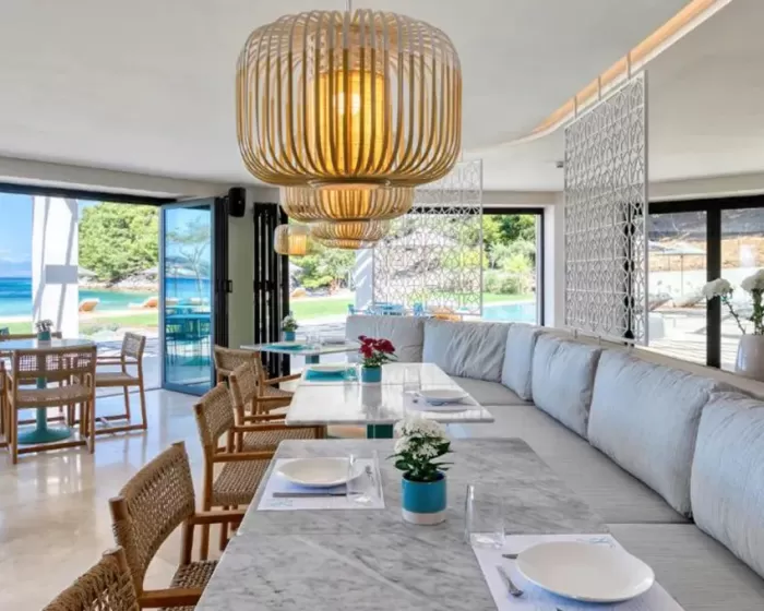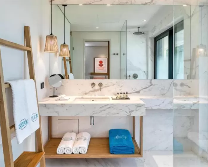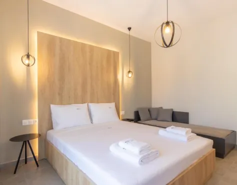presidental suite pogled more 60m2, maksimum 3 osobe: Soba ima francuski bračni krevet (udoban Simmons dušek). Smešten na gornjem nivou odmarališta, ovaj elegantni apartman sa odvojenim dnevnim boravkom nudi nesmetan, panoramski pogled na uvalu Vati, savršeno kombinujući zelene i tirkizne boje kristalno čiste vode mora. Dva kupatila sa sopstvenim kupatilom, oba sa kišnim tušem i samostojećom kadom u jednom od njih, sa opuštajućim pogledom na beskrajno plavo more.
