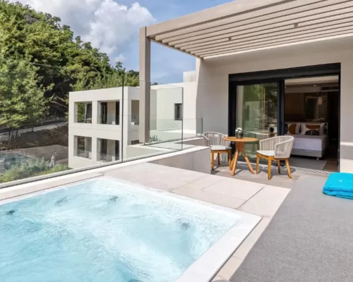 deluxe junior suite privatan bazen pogled more 34m2, maximum 2 osobe: Soba ima francuski bračni krevet (udoban Simmons dušek). Sa neverovatnim, opuštajućim pogledom na Egejsko more, ove sobe nude sve pogodnosti i usluge, kao i balkon/terasu sa udobnim nameštajem i privatnim bazenom. Mermerno kupatilo sa kišnim tušem i pogledom na more.