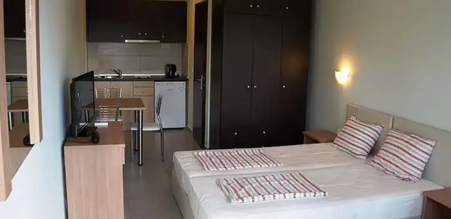 Ukupno 19 soba: Studio (~ 18-23 m²), Apartments (~ 31-36 m²), Apartments 1 Bedroom (~ 35m²), Suites (~ 45 m²). U sobama: mini kuhinja (električni šporet, mikrotalsna, kuvalo za vodu, posudje), frižider, klima-uredjaj, SAT TV, telefon, žičani i Wi-Fi internet, toalet sa tuš kabinom, fen, mreža za komarce, namešteni balkon/terasa, sušilica.Krevetac i visoke stolice za decu - na zahtev (jedan - po sobi).