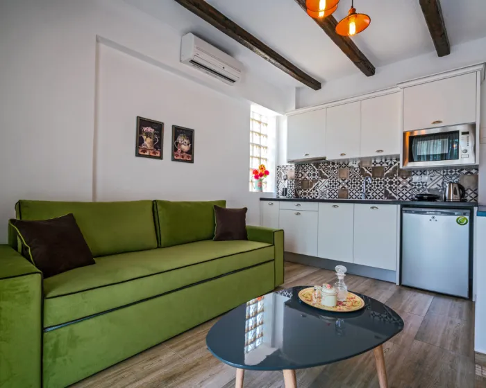 A - apartman / prostorija koju čini čajna kuhinja (obično bez rerne) opremljena osnovnim posuđem sa naznačenim brojem osnovnih ležajeva i odvojena prostorija sa naznačenim brojem osnovnih ležajeva, kupatilo, balkon ili terasa.