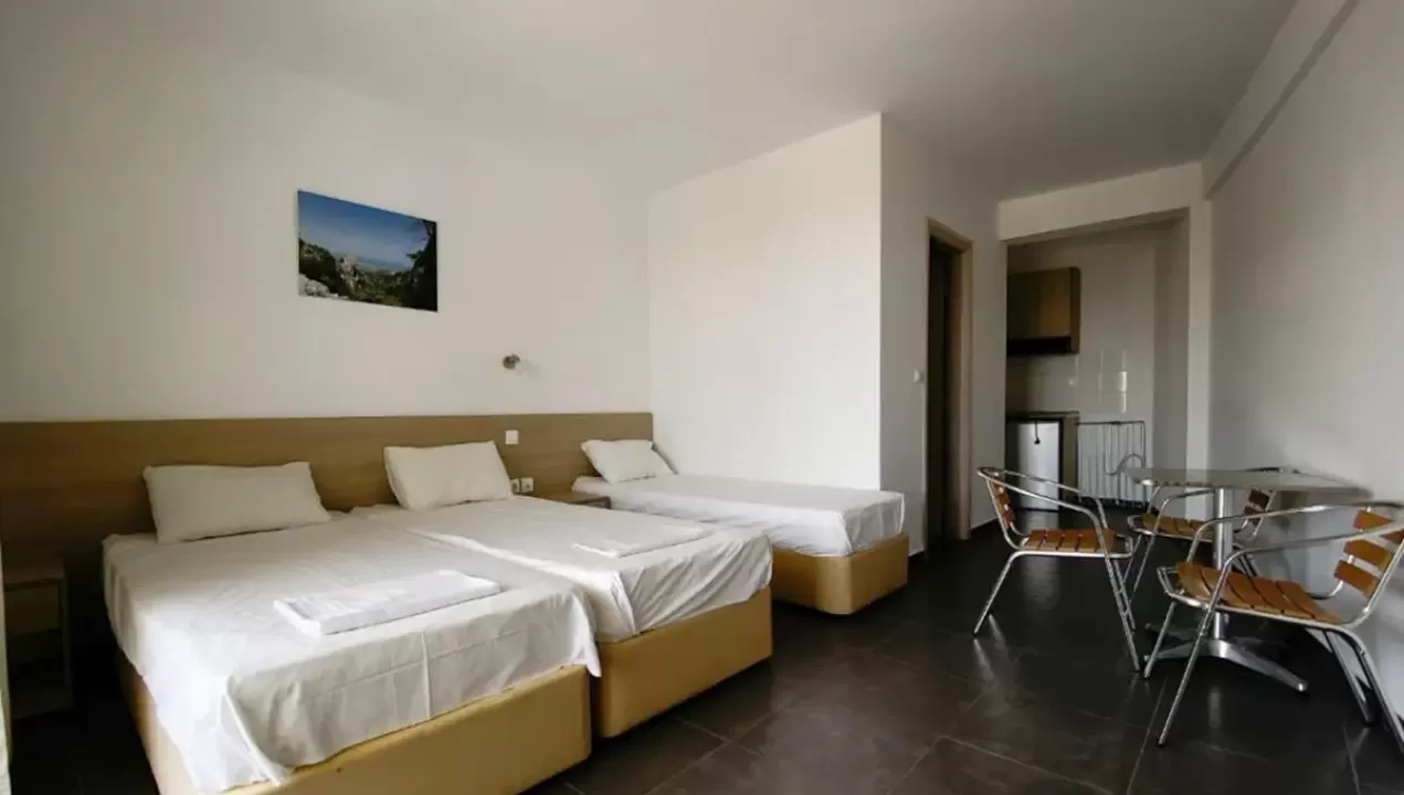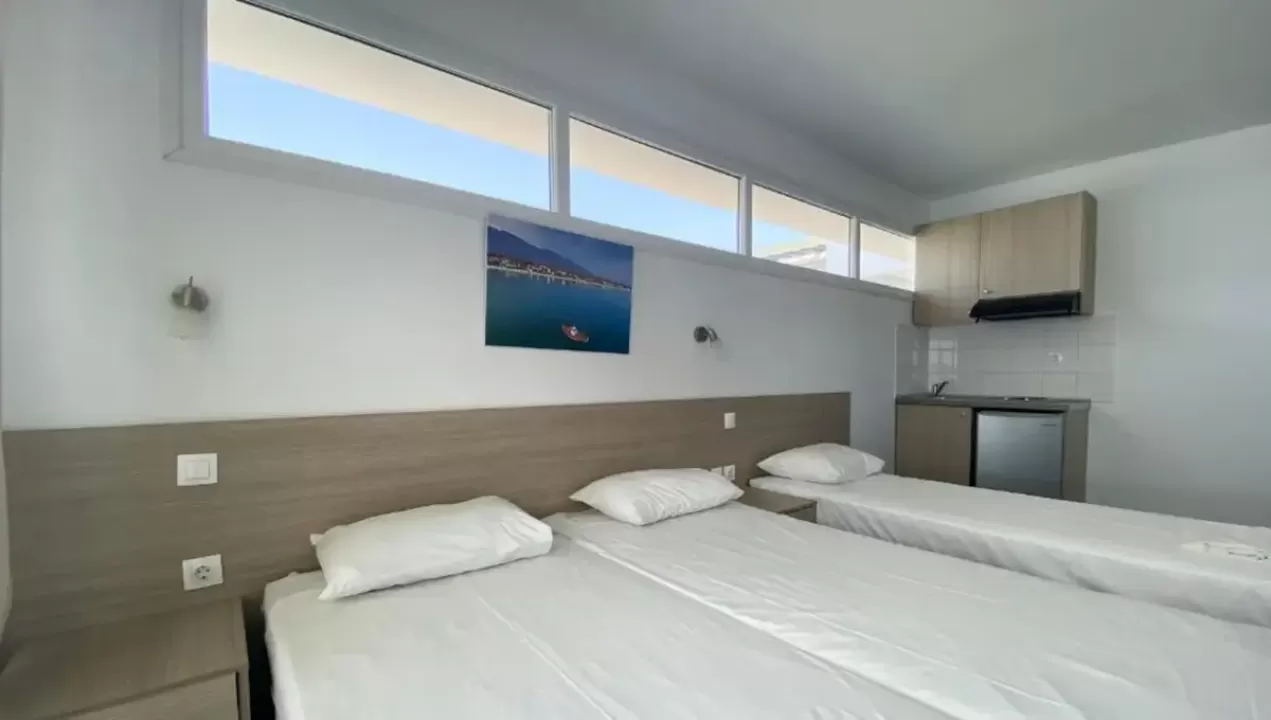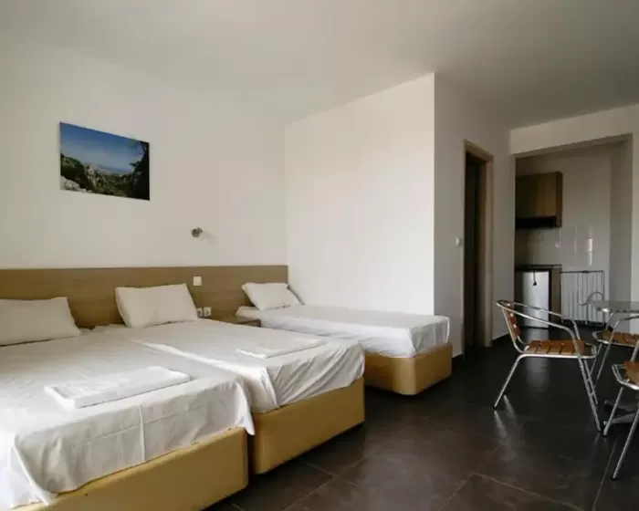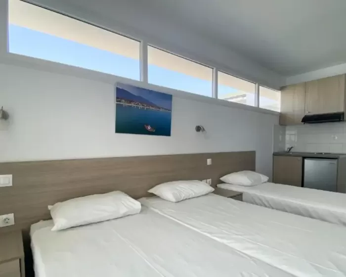 1/3 studio: trokrevetni studiji u svom sastavu poseduju ili tri singl standardna ležaja, ili francuski ležaj i jedan odvojeni singl ležaj, TV/KAT, ormar, noćni stočić, A/C (klima uredjaj) uračunat u cenu, besplatnu wifi internet konekciju, kompletno opremljenu kuhinju sa rešoom sa dve ringle, frižider. Kupatilo sa TUŠ/WC.