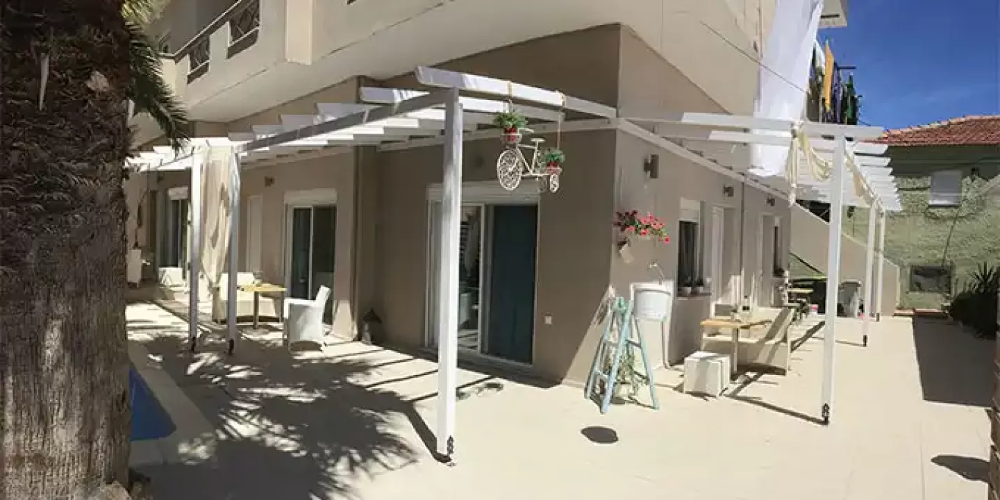 Vila Avli Sarti se nalazi u starom delu Sartija, prekoputa velikog marketa, i od uredjene plaže mesta je udaljena oko 80 metara. Vila Avli Sarti sadrži apartmane i studije u kojima mogu boraviti do maksimum četiri osobe. Sve smeštajne jedinice se nalaze u prizemlju, apartmani i studiji, a studiji imaju bračni ležaj i krevete na sprat za decu. Vila se nalazi prekoputa dva marketa u glavnoj ulici, preko puta Sarti Inn vile.