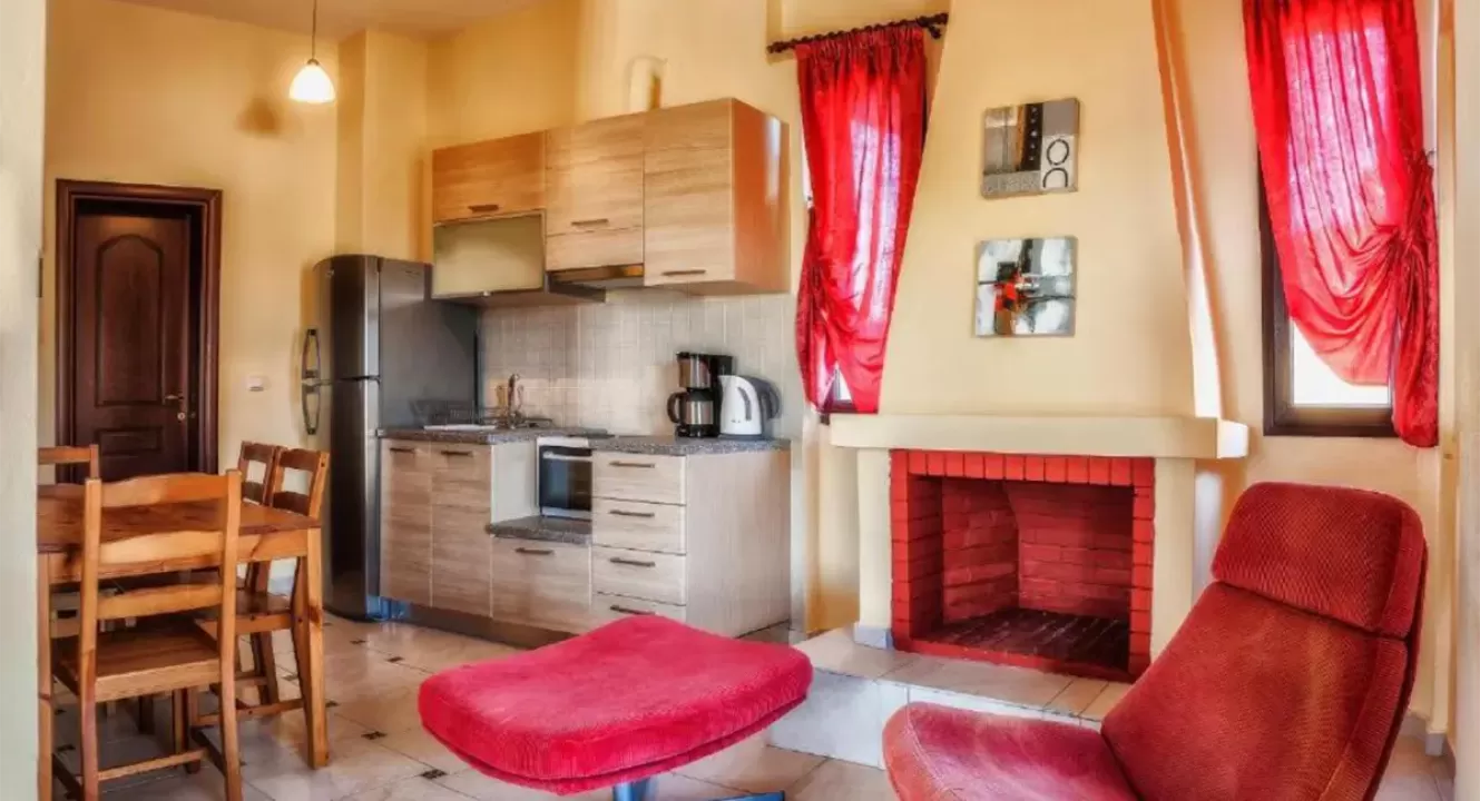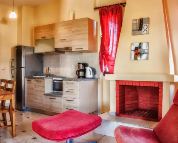 Broj 01: 1/4 apartman (pogled more) prizemlje – u jednoj prostoriji kuhinja i kanabe (160cm*200cm), a u drugoj prostoriji bračni ležaj.