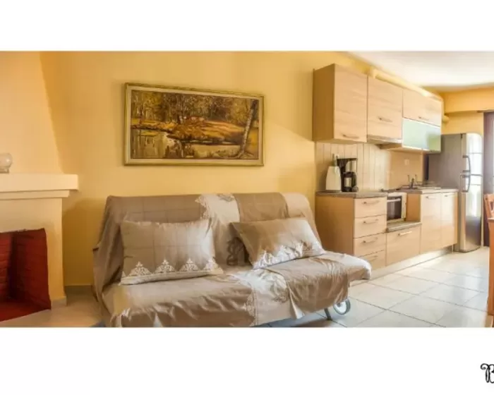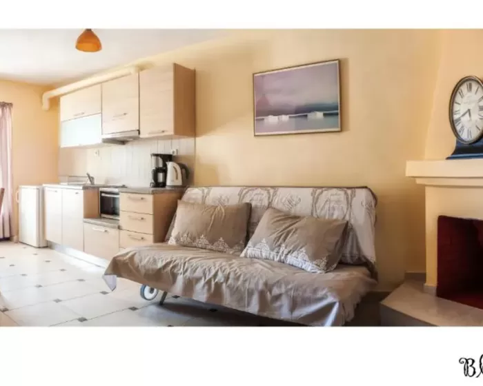 Broj 02: 1/4 apartman (pogled more) prizemlje – u jednoj prostoriji kuhinja i kanabe (160cm*200cm), a u drugoj prostoriji bračni ležaj.
