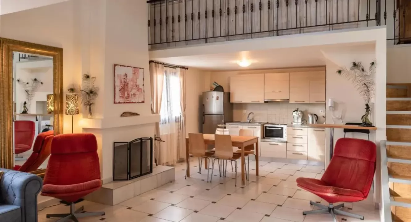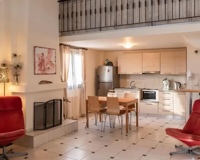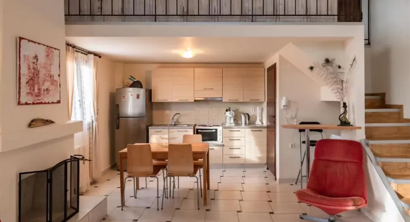 Broj 07: 1/5 loft mezoneta (pogled more) visoko prizemlje – u donjem nivou dnevni boravak sa kuhinjom i ugaonom garniturom (koja se otvara u singl ležaj), na gornjem nivou (iznad kuhinje) jedna galerija sa bračnim ležajem (160cm*200cm) i druga galerija (iznad ugaone garniture) sa bračnim ležajem (140cm*200cm). Ima i veš mašinu.