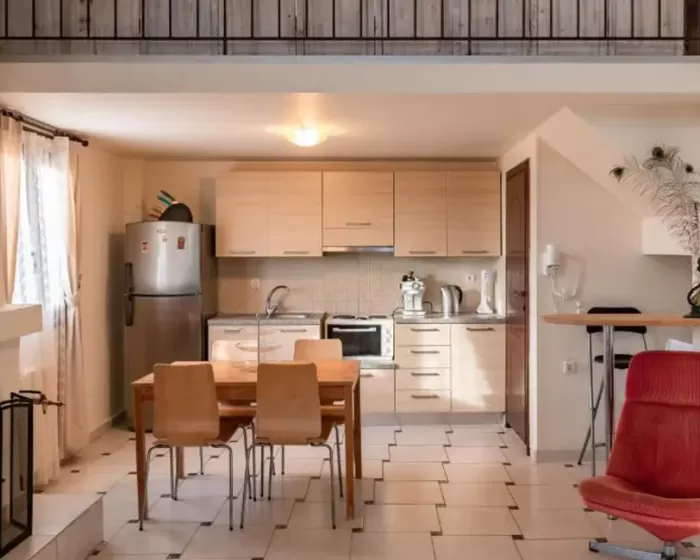 Broj 05: 1/4 apartman (pogled more) 1. sprat – u jednoj prostoriji kuhinja i kanabe (160cm*200cm), a u drugoj prostoriji bračni ležaj.