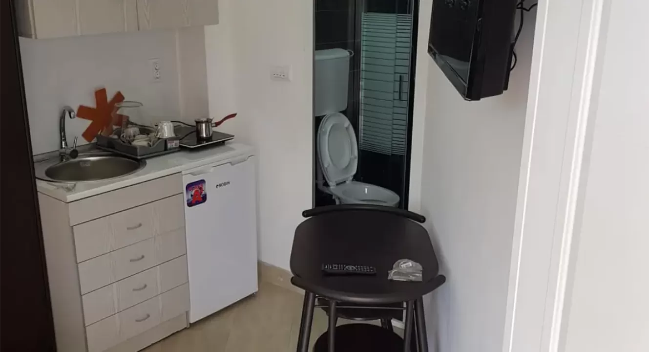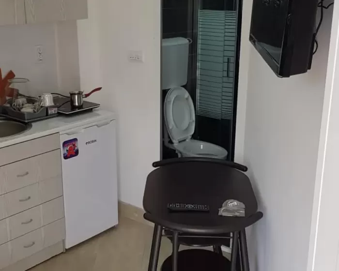 kupatilo, mini-kuhinja, frižider, klima-uredjaj, TV, terasa sa garniturom za sedenje.