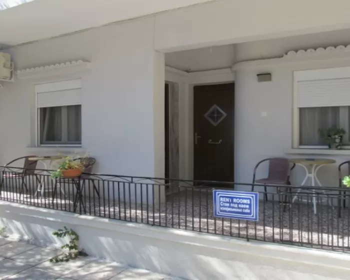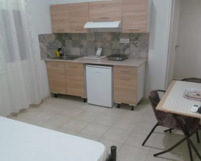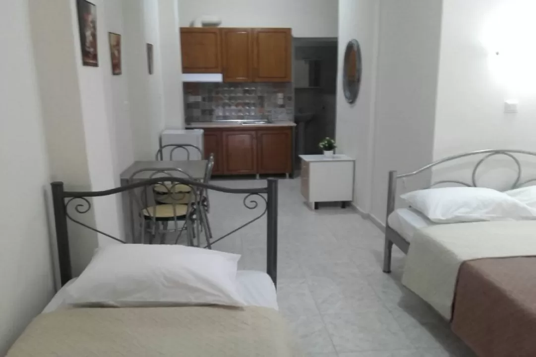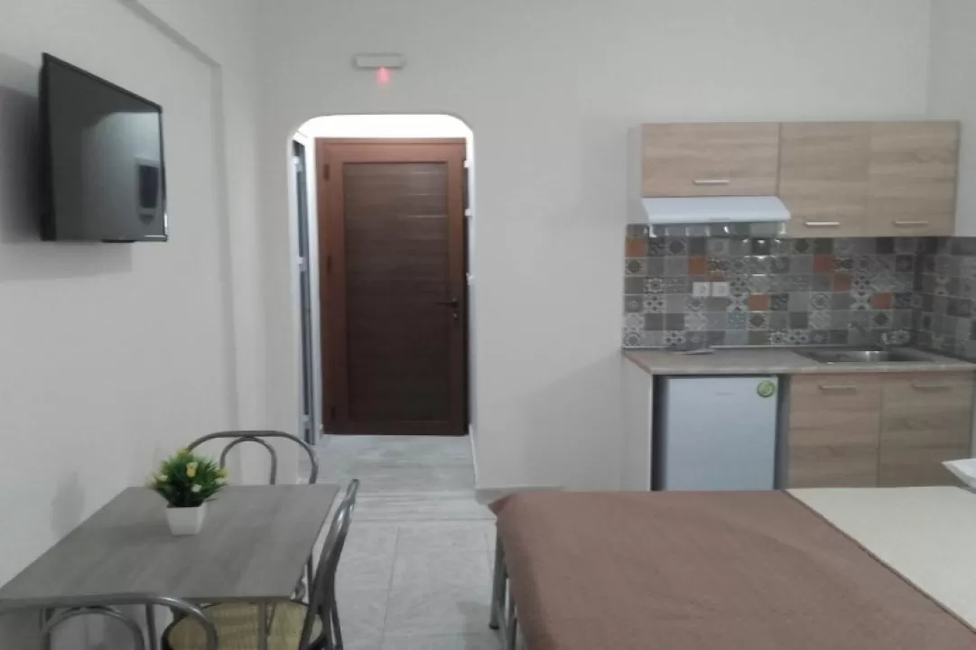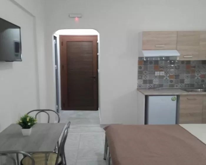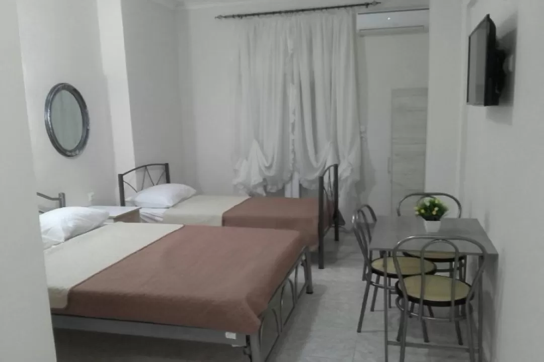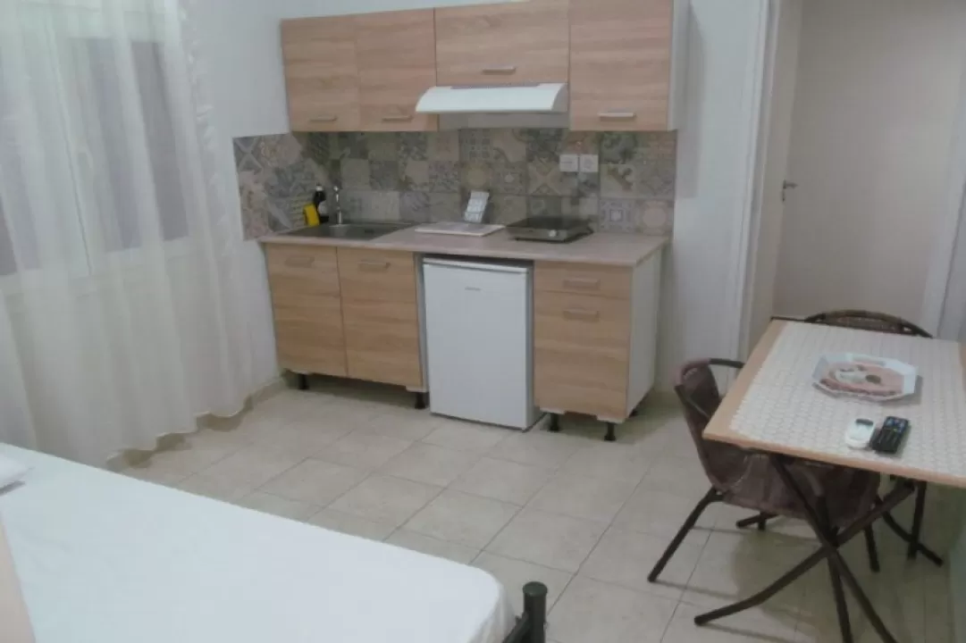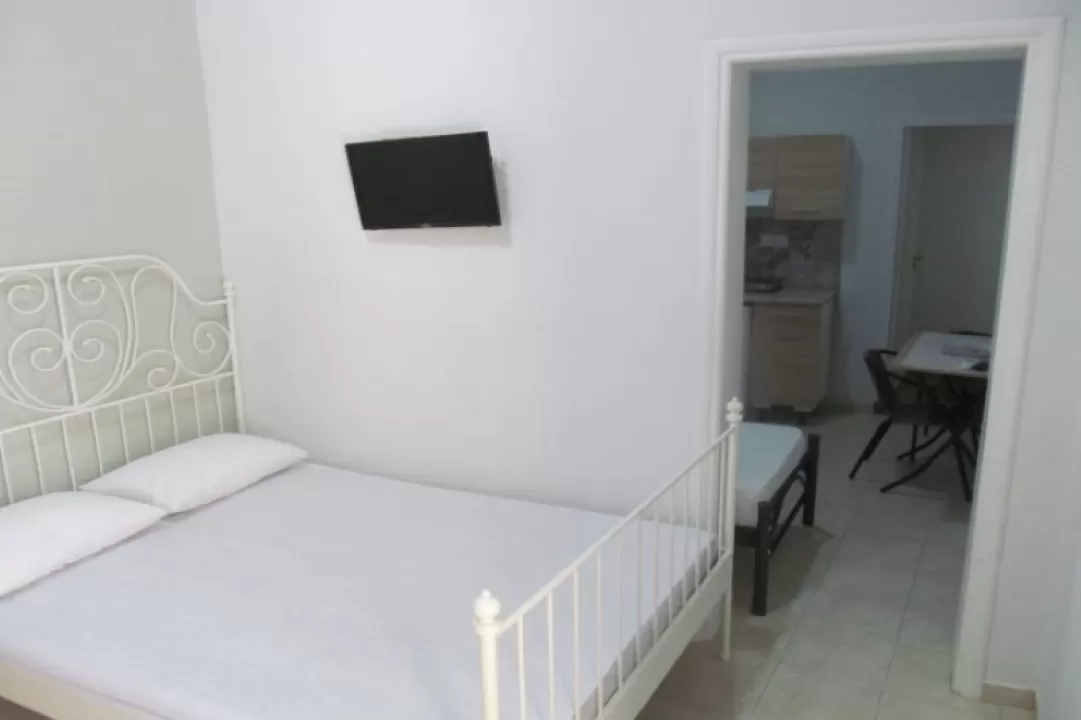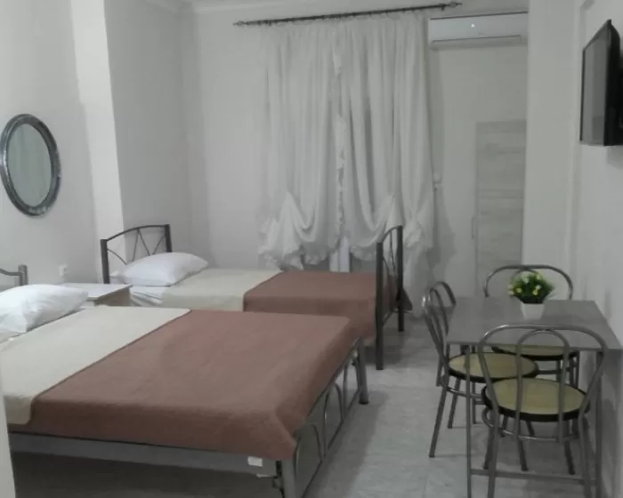 Jedan od dvokrevetnih studija i trokrevetni apartman u prizemlju imaju zajedničku terasu.