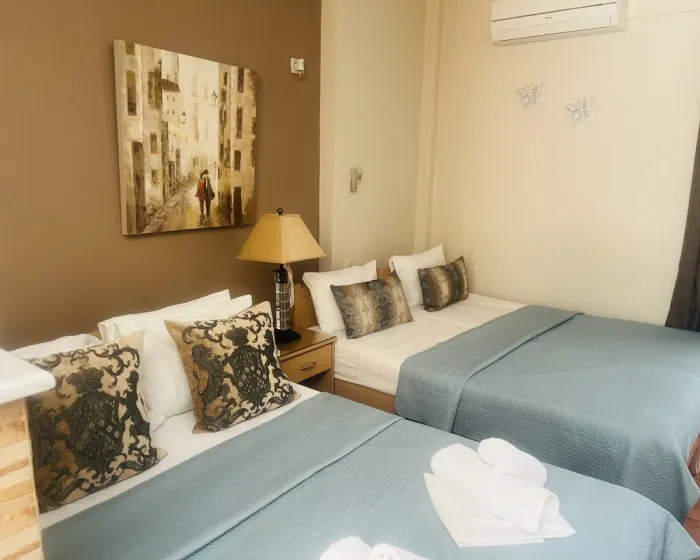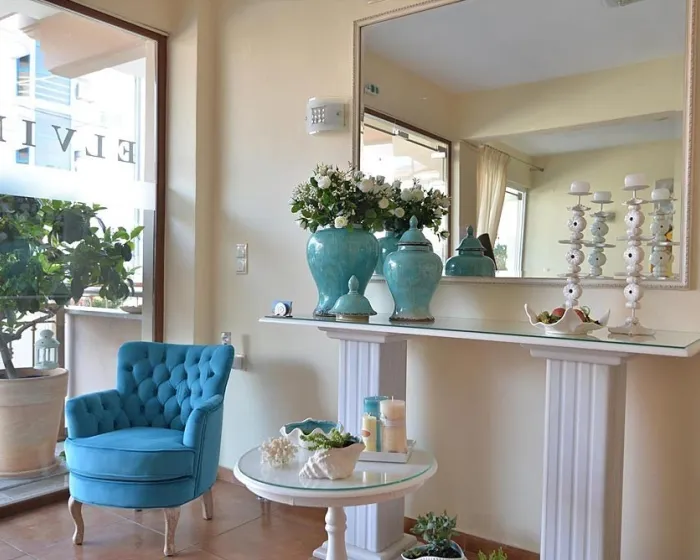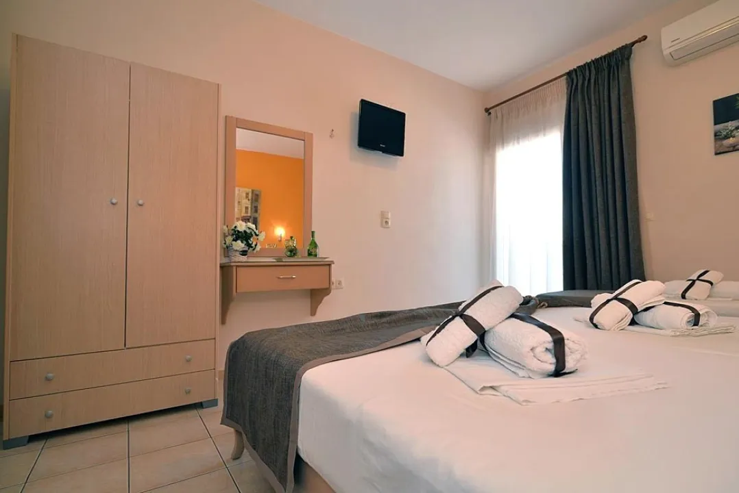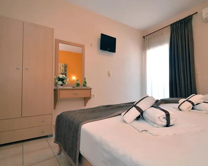 Poseduje manji lobi i recepciju, a raspolaže dvokrevetnim, trokrevetnim i četvorokrevetnim studijima od kojih svaki poseduje terasu, kuhinju, kupatilo sa fenom za kosu, LCD-TV i klimu čije se korišćenje doplaćuje na licu mesta. Dobro opremljena kuhinja sadrži rešo sa dve ringle, aspirator, ketler, posuđe.