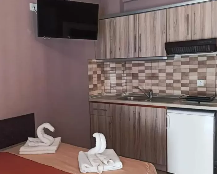 kupatilo, opremljena mini-kuhinja, mikrotalasna, frižider, SAT-TV, klima-uredjaj, terasa sa garniturom za sedenje