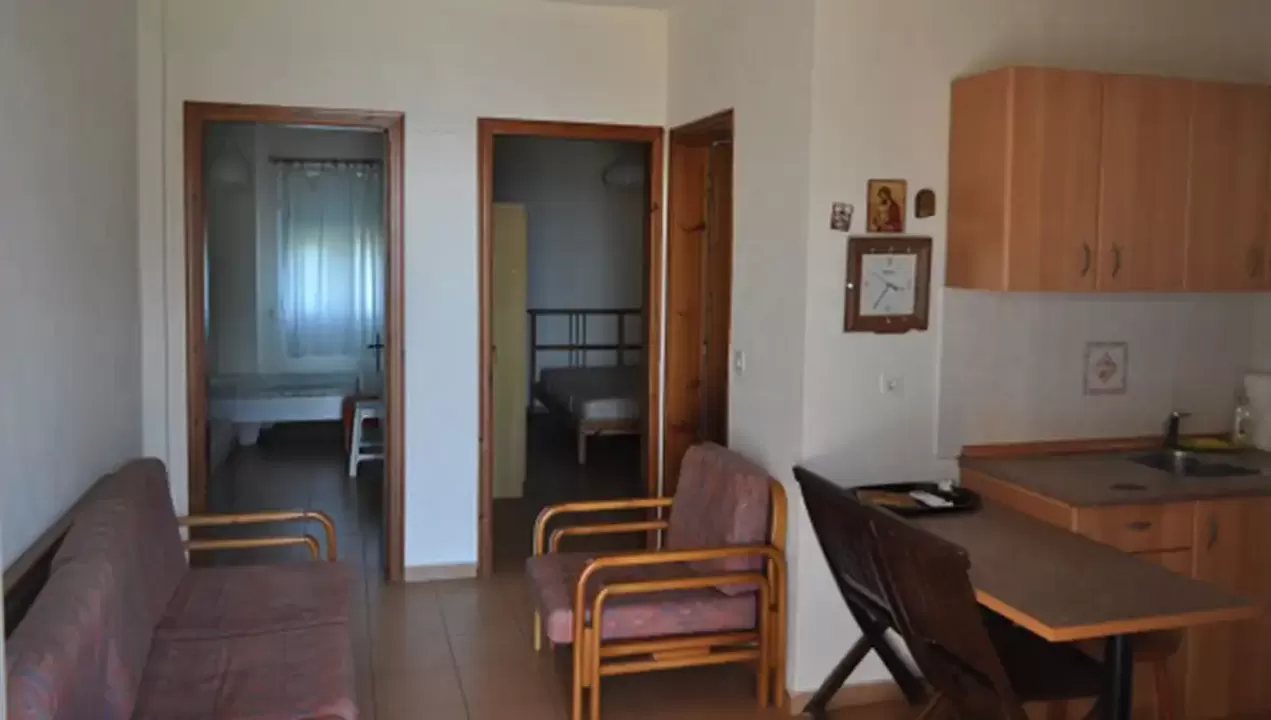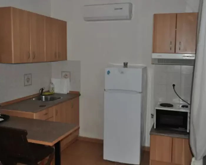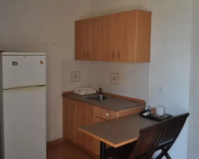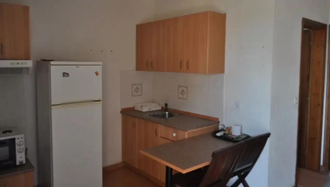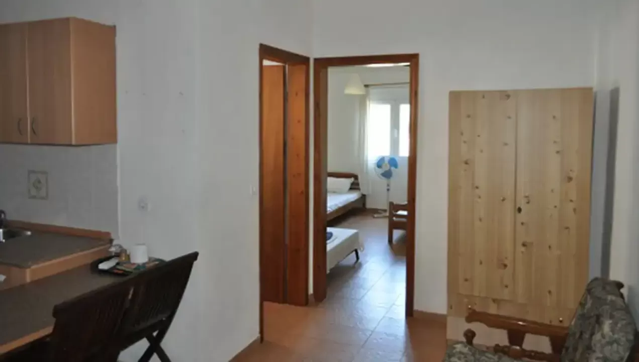 apartman: spavaća soba raspolaže francuskim ležajem i jednim singl ležajem, kuhinjski deo u kome se nalazi jedan sing ležaj i koji sadrži šporet sa dve ringle i rernom, frižider, sudoperu i elemente sa osnovnim kuhinjskim inventarom.