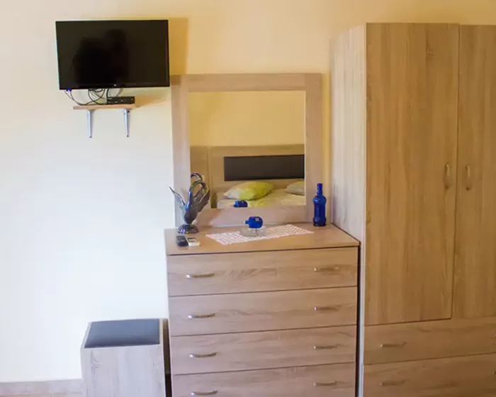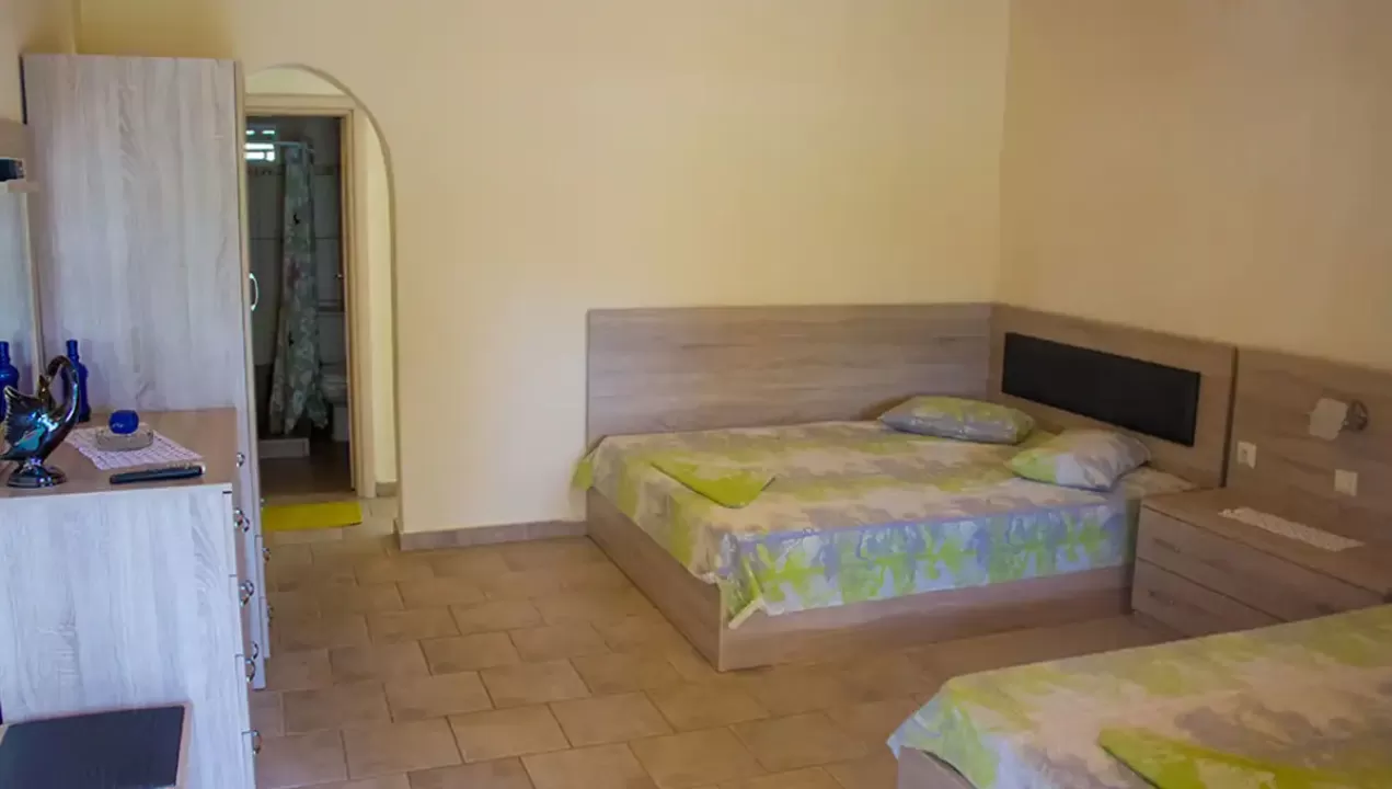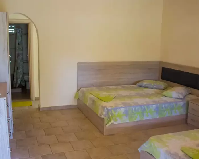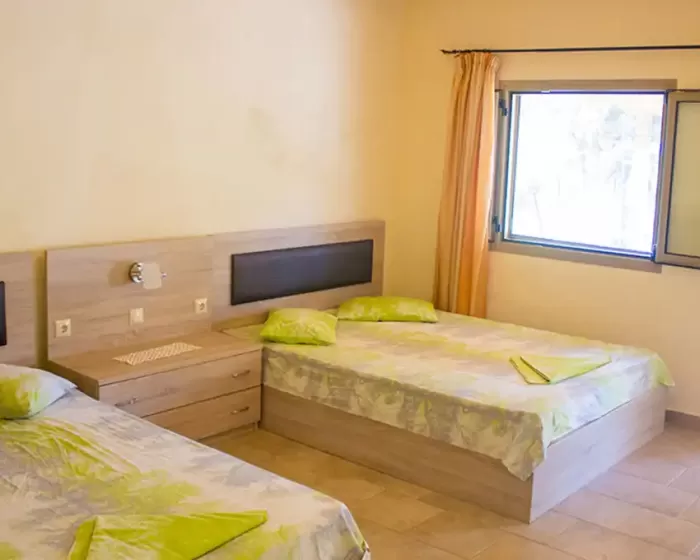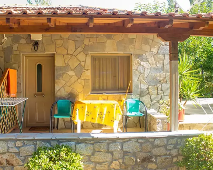Smešteni su u prizemlju, imaju lepe, prostrane terase. Kuhinja je blago izdvojena od spavaćeg dela koji ima ili francuski i klasičan ili dva francuska kreveta. Na pola smene je organizovano čišćenje smeštaja. Svi imaju TV, signal za besplatno korišćenje bežičnog interneta kao i klima uredjaj čije je korišćenje uključeno u cenu. Gostima je na raspolaganju i parking.