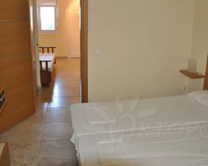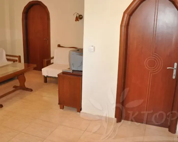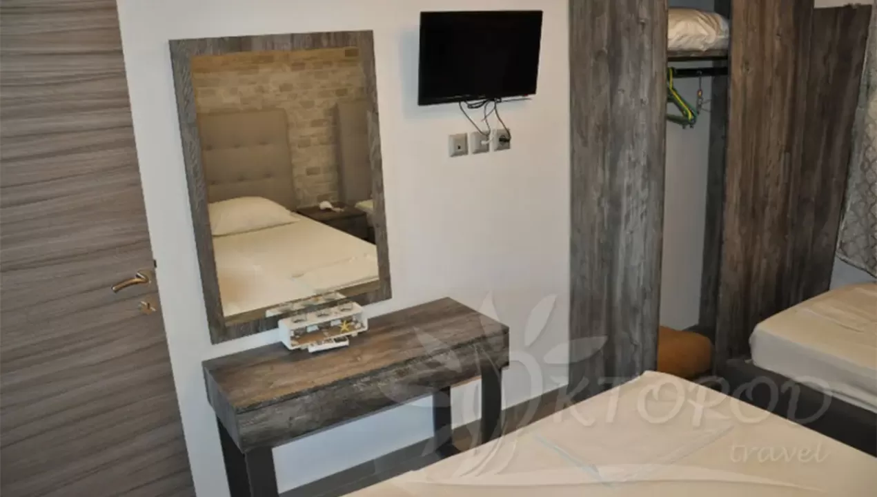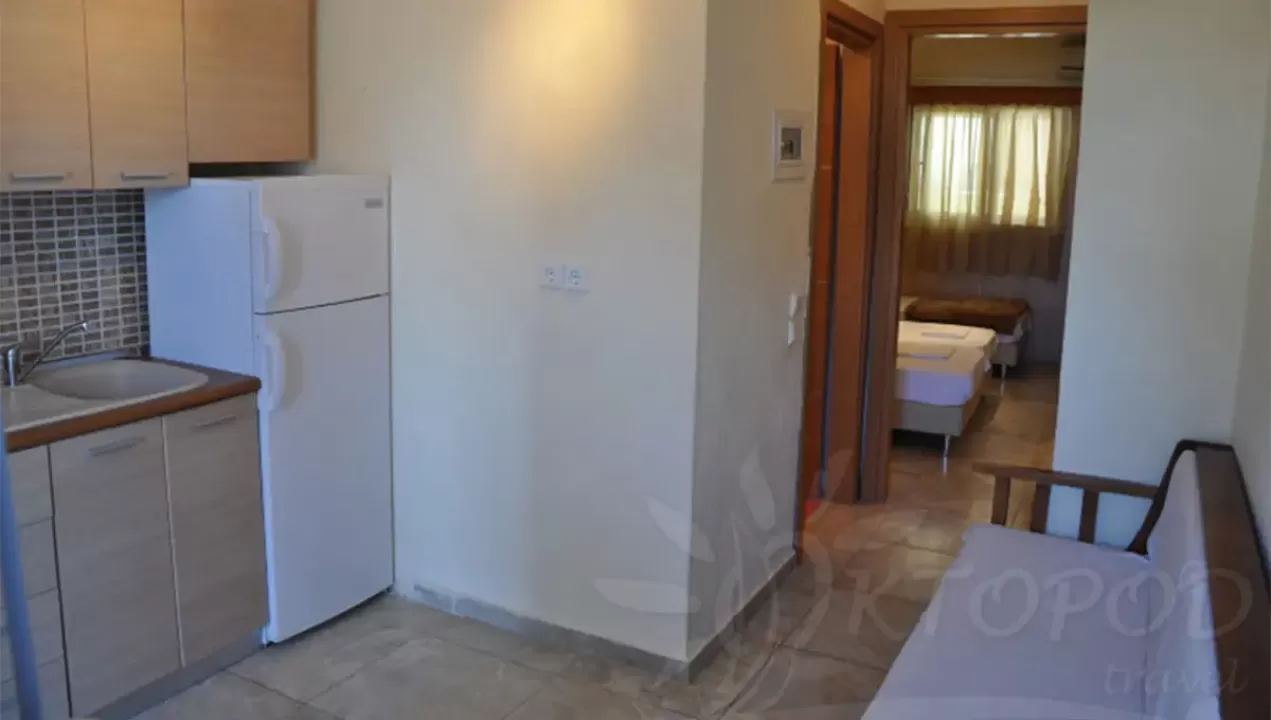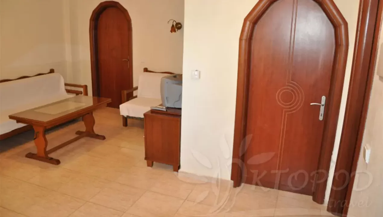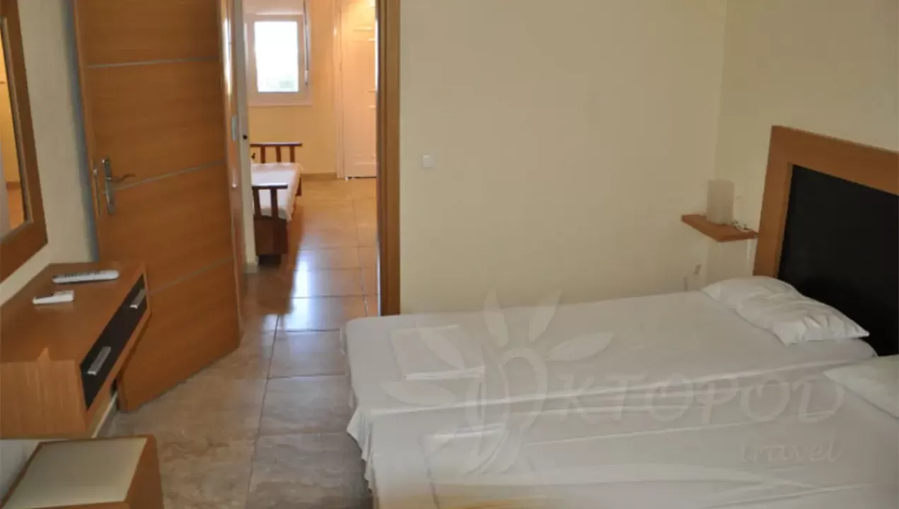 Apartmani poseduju  opremljen kuhinjski deo, kupatilo/wc, prostor sa garniturom za sedenje sa direktnim pogledom na more, TV, Wi-fi (dostupan od 01.06) i klima uređaj (uključen u cenu aranžmana).. Na pomoćnom ležaju može da spava dete do 6.99 godina.