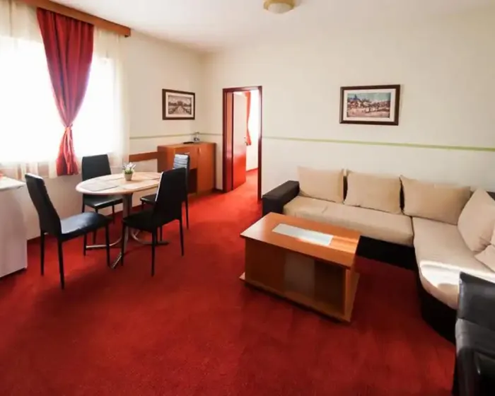 U ponudi Vile Larus imate na raspolaganju 2 sobe sa francuskim ležajem i 5 dvokrevetnih soba sa odvojenim ležajima sa mogućnošću spajanja kreveta. Svaka soba ima zasebno kupatilo (tuš kabina), LCD-TV, besplatan WiFi pristup internetu, radni sto i orman. Svaka soba je klimatizovana.Studio apartman, uredjen u vidu studia, raspolaže sa jednim francuskim i jednim pomoćnim ležajem, osim toga postoji mogućnost da se smesti i krevet za dete ili još jedan pomoćni ležaj. Kuhinja je opremljena mikrotalasnom pećnicom, rešoom i frižiderom i kuhinjskim priborom. Prostran dnevni boravak je opremljen LCD televizorom, besplatnim wifi internet pristupom, a u kupatilu se nalazi tuš kabina ili kada. Studio apartman je klimatizovan.Porodična soba je opremljena sa francuskim ležajem i singl krevetom sa mogućnošću izvlačenja čime se dobija pomoćni ležaj. Maximalni kapacitet sobe je 4 osobe. Sobu predlažemo za četvoročlanu porodicu. Soba ima zasebno kupatilo (tuš kabina), LCD-TV, besplatan wifi pristup internetu, fen za kosu, radni sto i orman. Soba je klimatizovana.Apartman s jednom spavaćom sobom čine dve odvojene prostorije - dnevni boravak i spavaća soba. U spavaćoj sobi se nalaze dva ležaja- jedan francuski i jedan predviđen za jednu osobu, sa mogućnošću izvlačenja. Dnevna soba je predviđena za smeštaj dve osobe, a maksimalna iskorišćenost kapaciteta omogućuje smeštaj čak šest osoba. Kuhinja je opremljena mikrotalasnom pećnicom, rešoom, frižiderom i kuhinjskim priborom. Prostran dnevni boravak je opremljen LCD televizorom 82\", besplatnim wifi internet pristupom, a u kupatilu se nalazi kada. Apartman je klimatizovan.