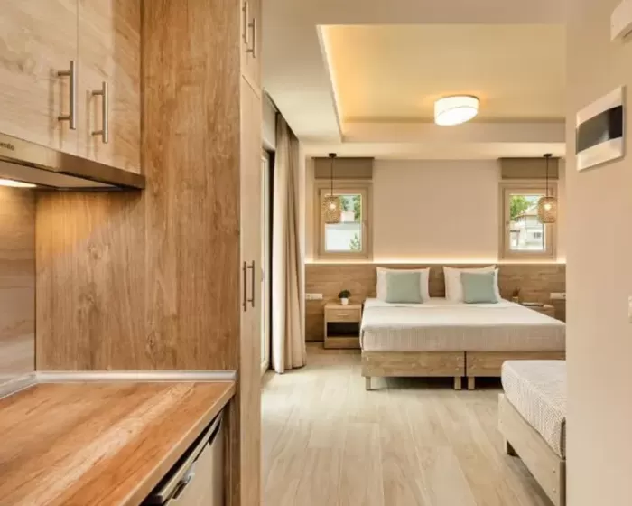 1/4 studio - u jednoj prostoriji čajna kuhinja, dva standardna i jedan bračni ležaj.