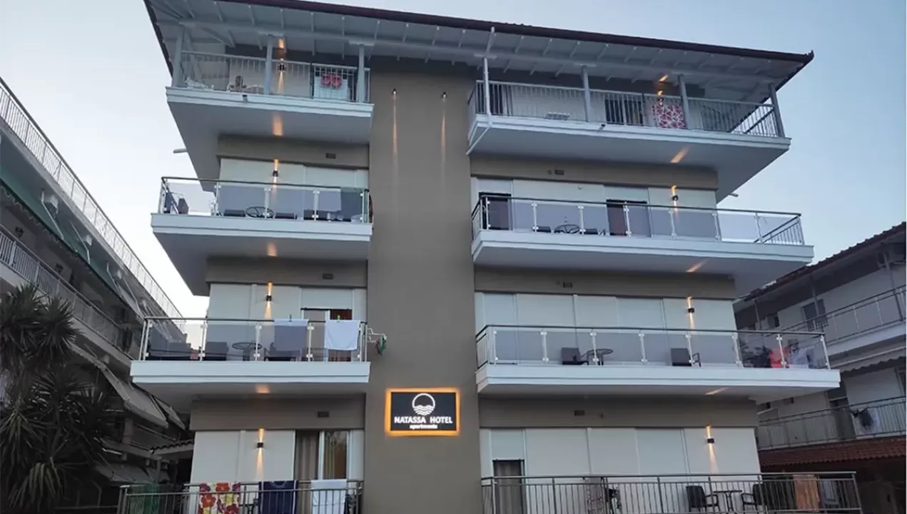 Vila Natasa Hanioti se nalazi u letovalištu Hanioti, na oko 200 metara udaljenosti od peščane plaže i oko 150 metara od centra. Parking se nalazi preko puta same vile, rezervacija parkinga je neophodna i vrši se u agenciji; doplata 5€ po danu. Promena posteljine i peškira se obavlja na 5 dana. Dečije igralište i ambulanta se nalaze na oko 100 metara od vile.