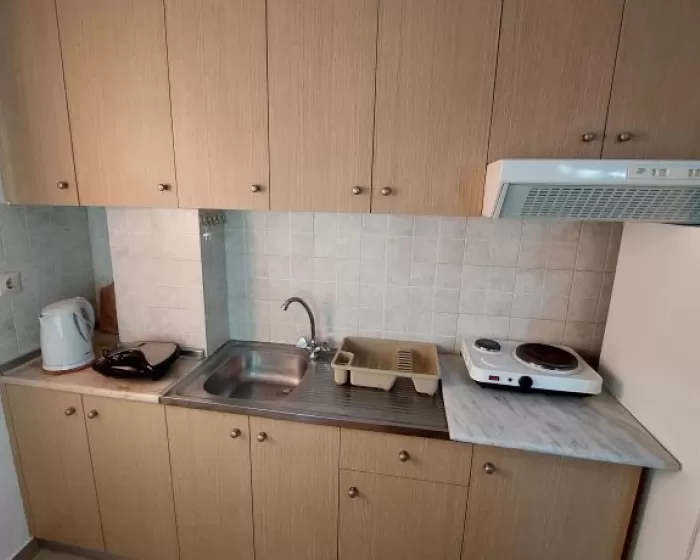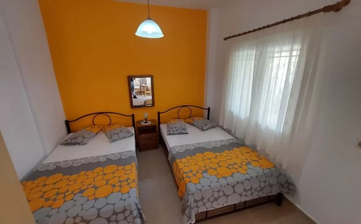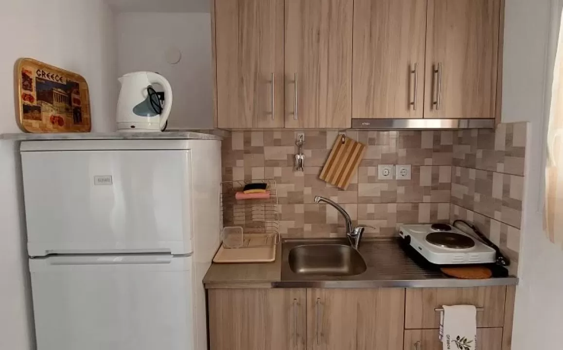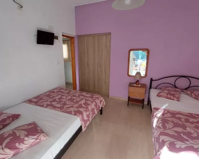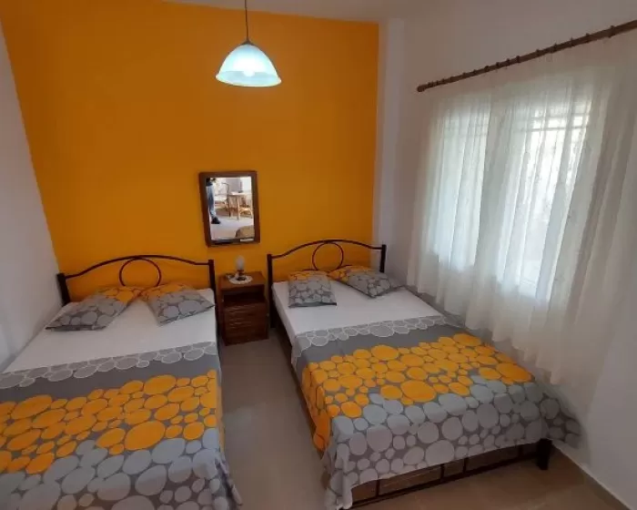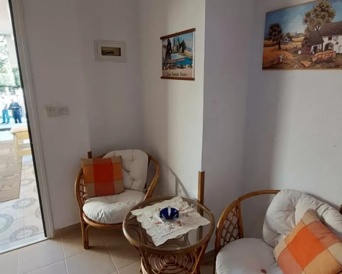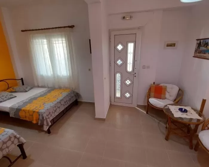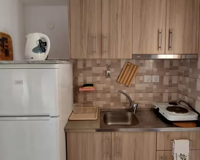 Kuhinja (veliki frižider sa zamrzivačem, rešo sa dve ringle na struju, aspirator, mali toster, posudje i pribor), kupatilo, dva manja francuska ležaja širine 130 cm, orman, noćni ormarić, ogledalo, televizor, WI FI (besplatan), klima uredjaj, terasa sa garniturom za sedenje i tenda. Predvidjeni su za smeštaj maksimalno dvoje odraslih i dvoje dece do 11.99 godina, ili troje odraslih i jedno dete do 11.99 godina.