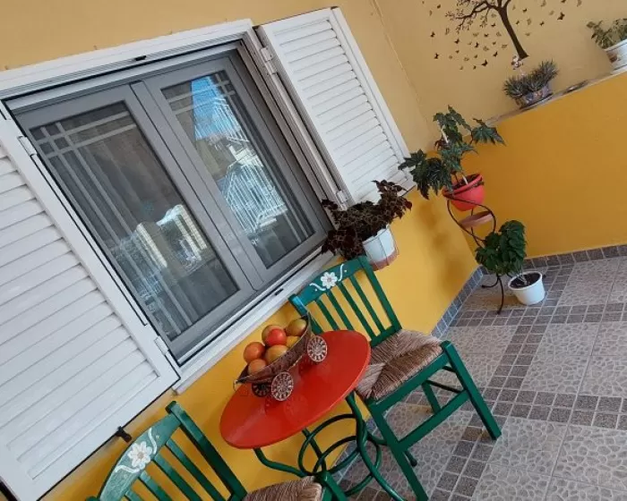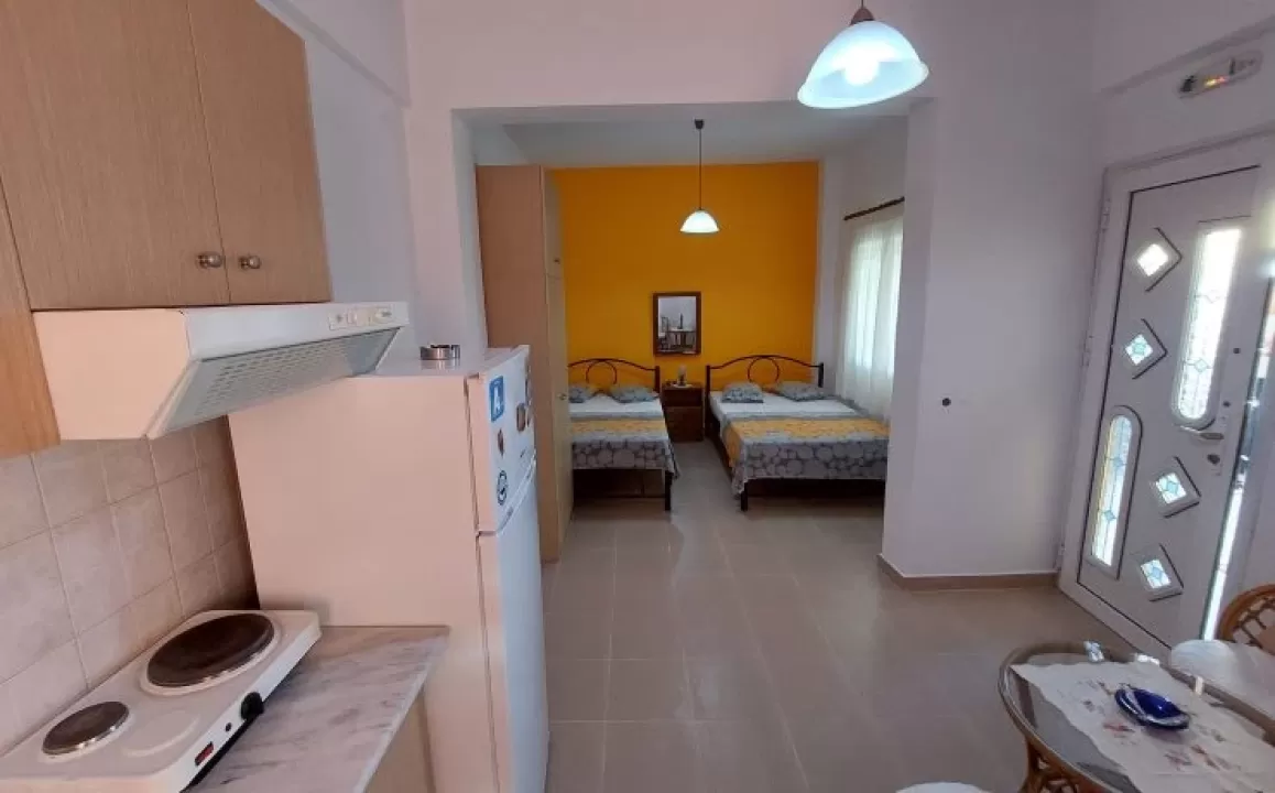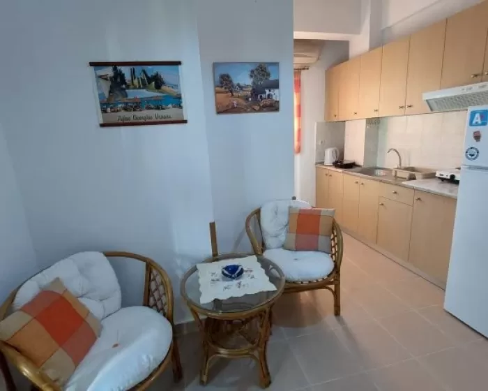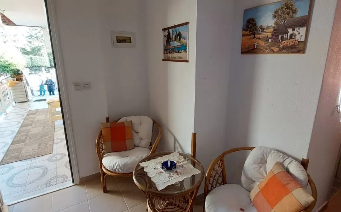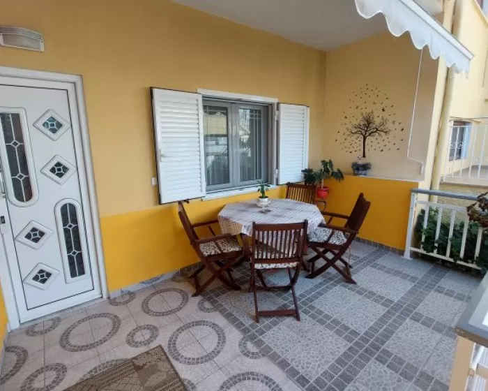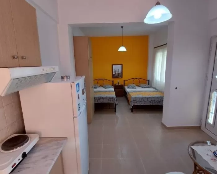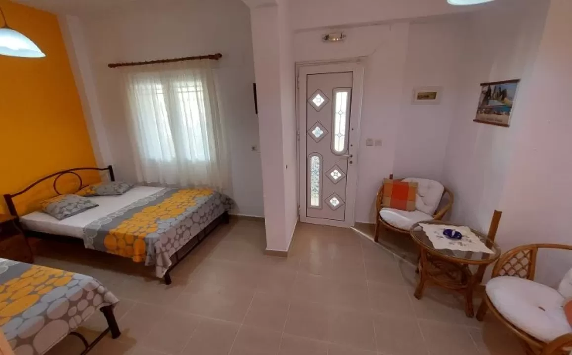 Kuhinja (veliki frižider sa zamrzivačem, rešo sa dve ringle na struju, aspirator, mali toster, posudje i pribor), kupatilo, dva manja francuska ležaja širine 130 cm, orman, noćni ormarić, ogledalo, televizor, WI FI (besplatan), klima uredjaj, terasa sa garniturom za sedenje i tenda. Predvidjeni su za smeštaj maksimalno dvoje odraslih i dvoje dece do 11.99 godina, ili troje odraslih i jedno dete do 11.99 godina.