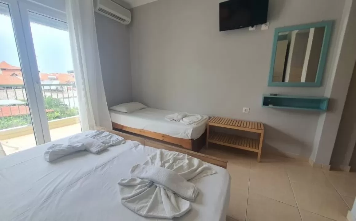 Vila Orosimo Pefkohori se nalazi u samom centru Pefkohorija, kod kružnog toka, na 100m od plaže. Vila ima idealnu lokaciju. Ispod vile se nalazi veliki supermarket, a u neposrednoj blizini su pekare, restorani, bus i taxi stanica. Sve smeštajne jedinice sadrže kuhinju (mini električni šporet, frižider, posuđe), kupatilo, klima uređaj koji je uračunat u cenu najma, TV, Wi-Fi internet, peškire, terase na kojima se nalaze garniture za sedenje i koje su zaštićene tendama. Promena posteljine i peškira je na 5 dana, dok je čišćenje na dan smene.