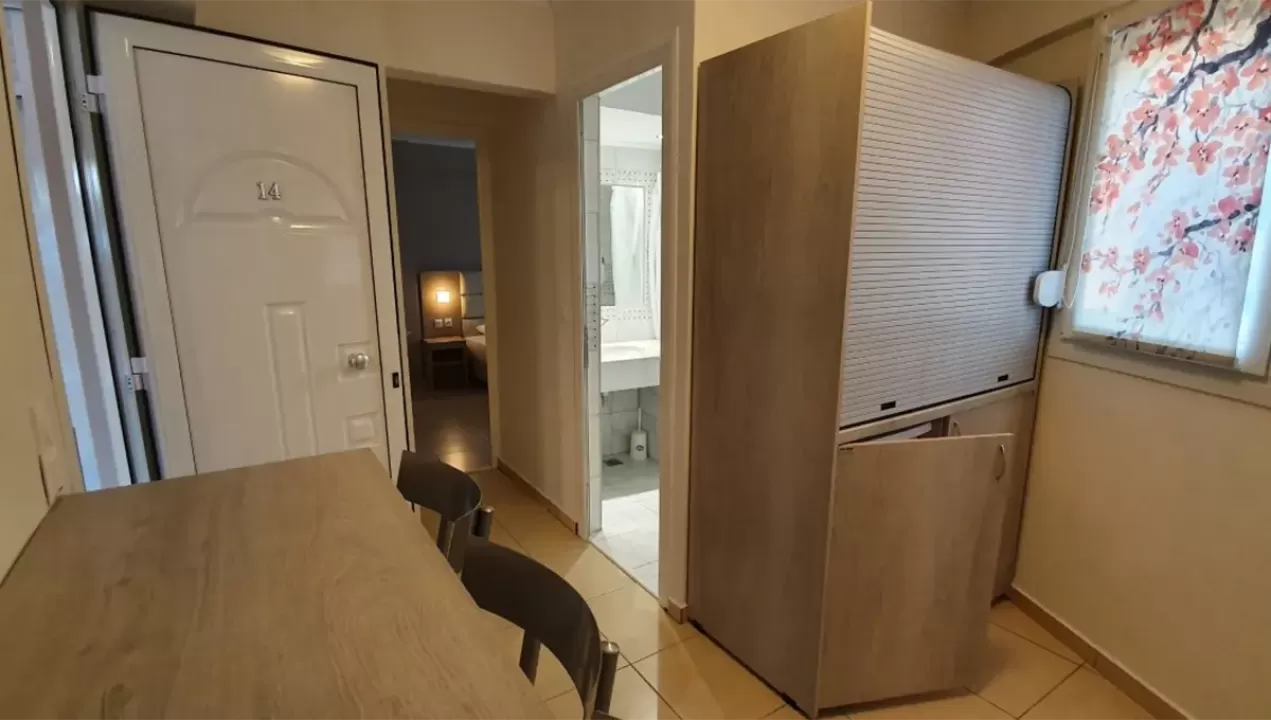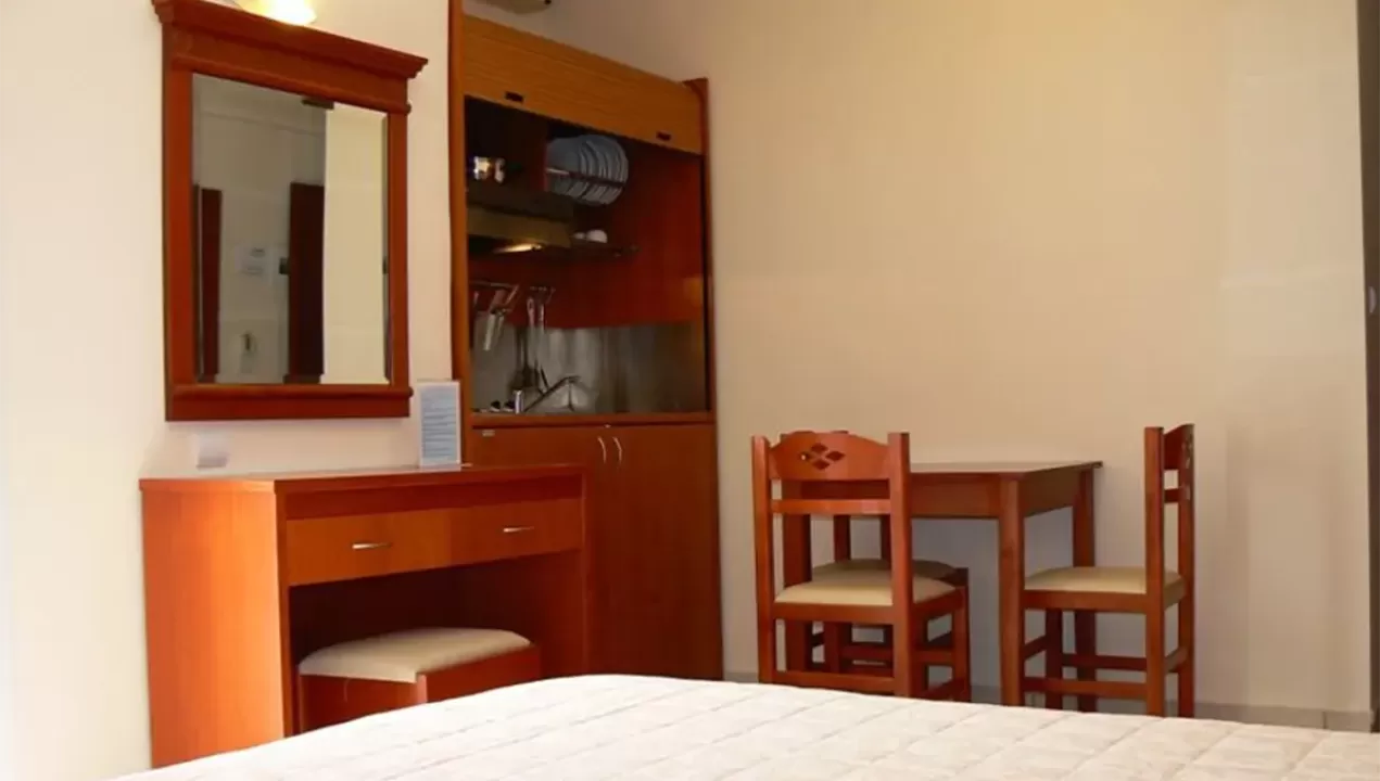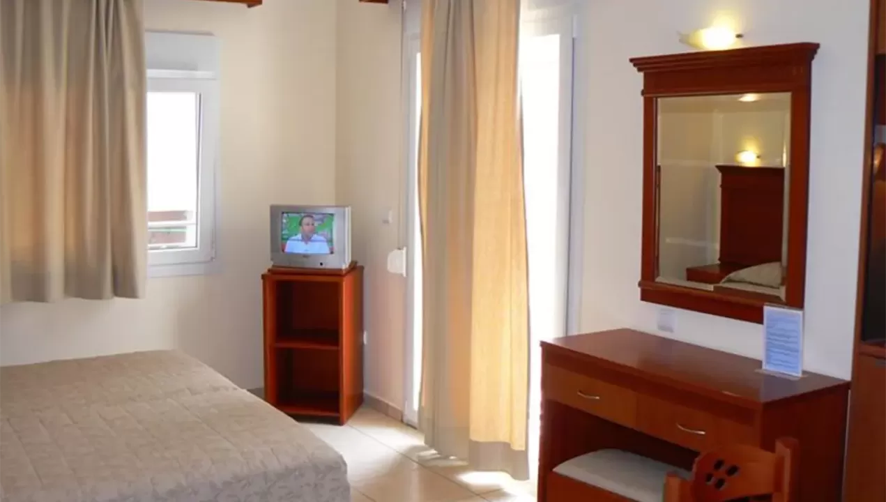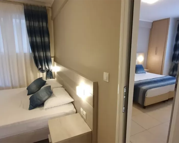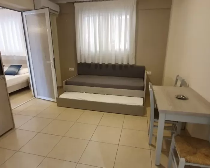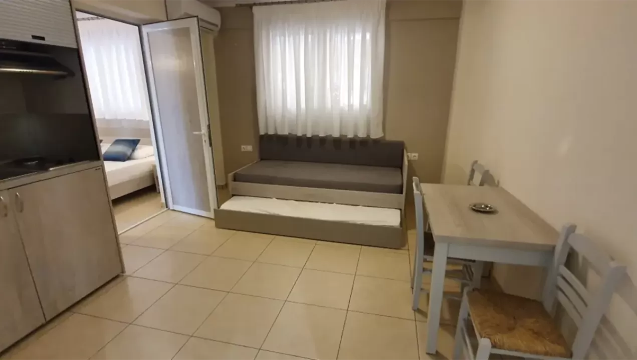1/4 apartman - u jednoj prostoriji čajna kuhinja, u drugoj prostoriji jedan bračni ležaj, u trećoj prostoriji jedan bračni ležaj.U pojedinim slučajevima moguća su odstupanja mera ležaja od našeg standarda.Grčki standard za normalni ležaj je 185cm-200cm sa 75-90cm, a bračni ležaj (dve osobe) 185-200cm sa 120-155cm.