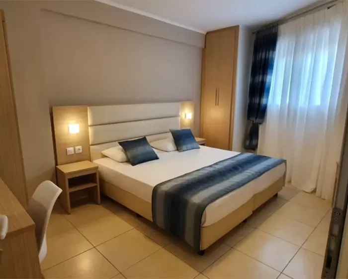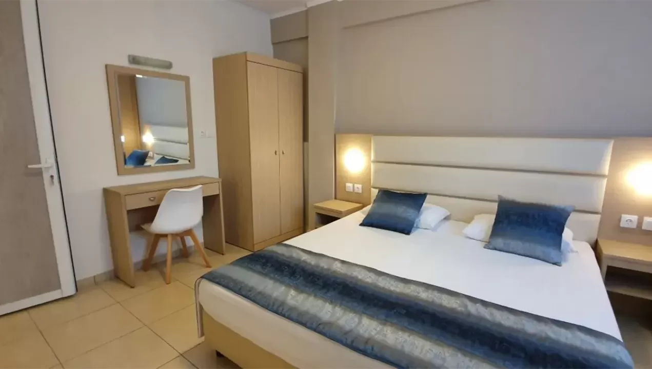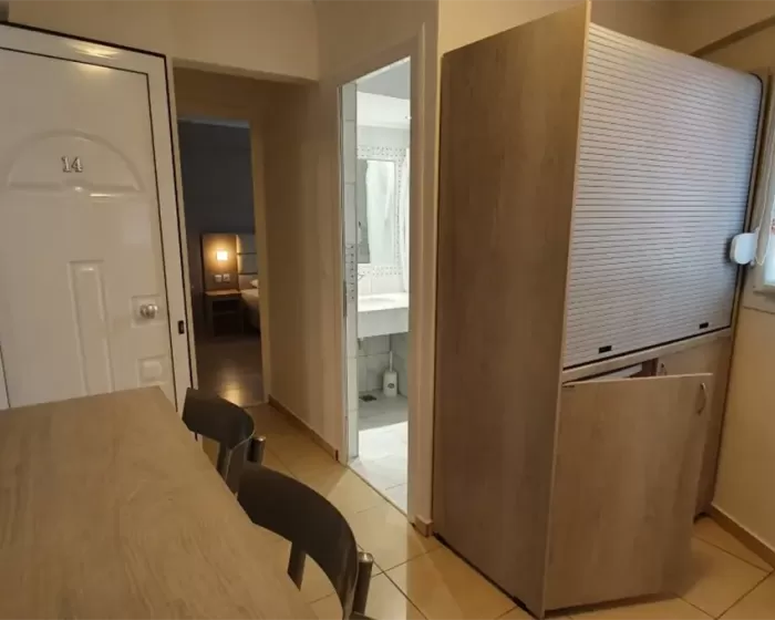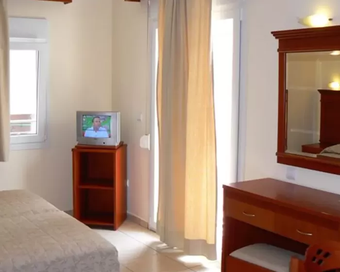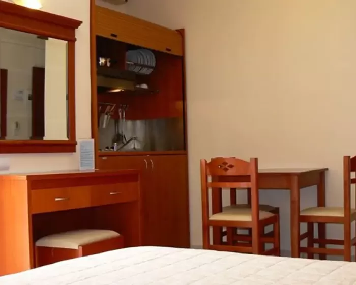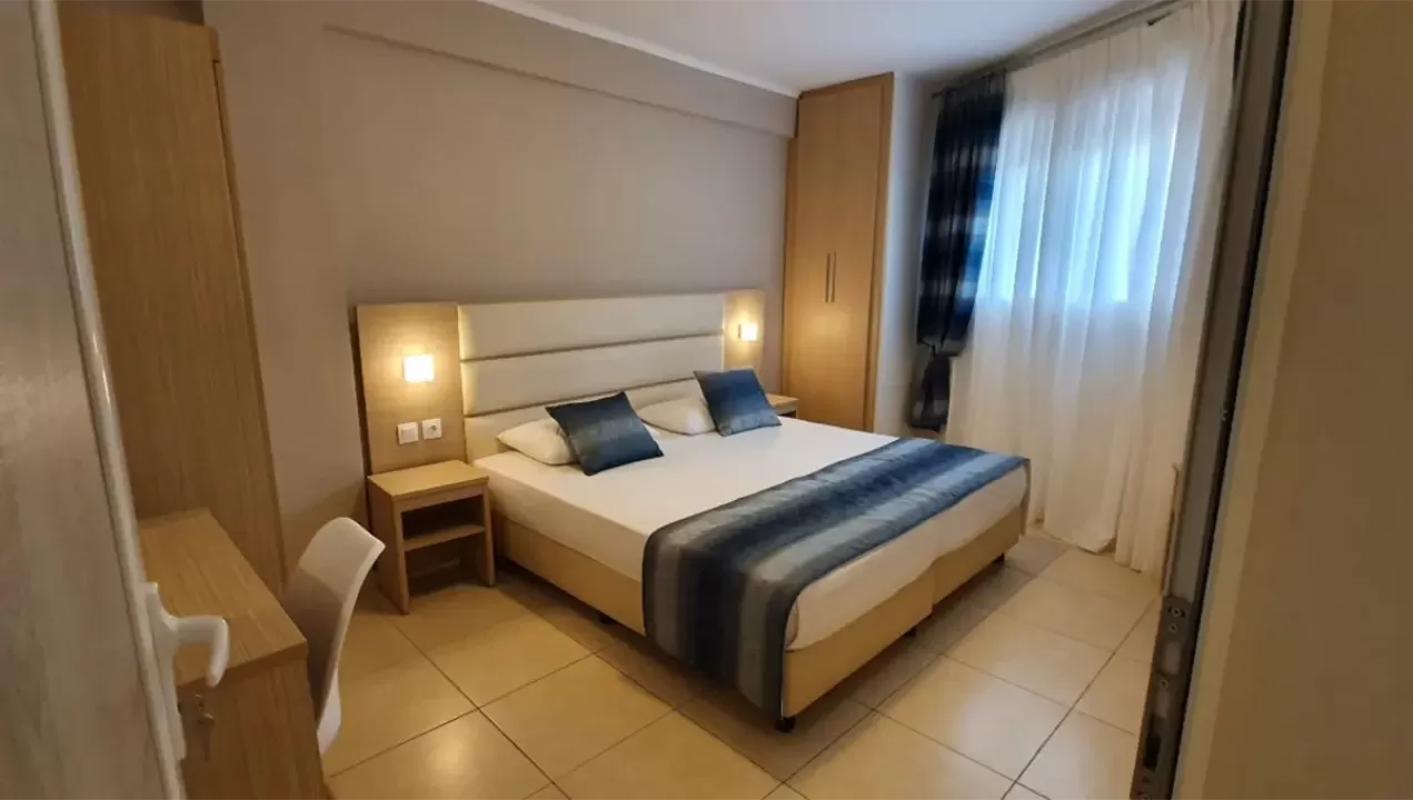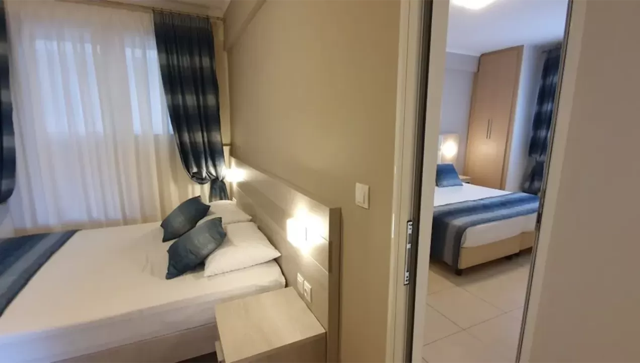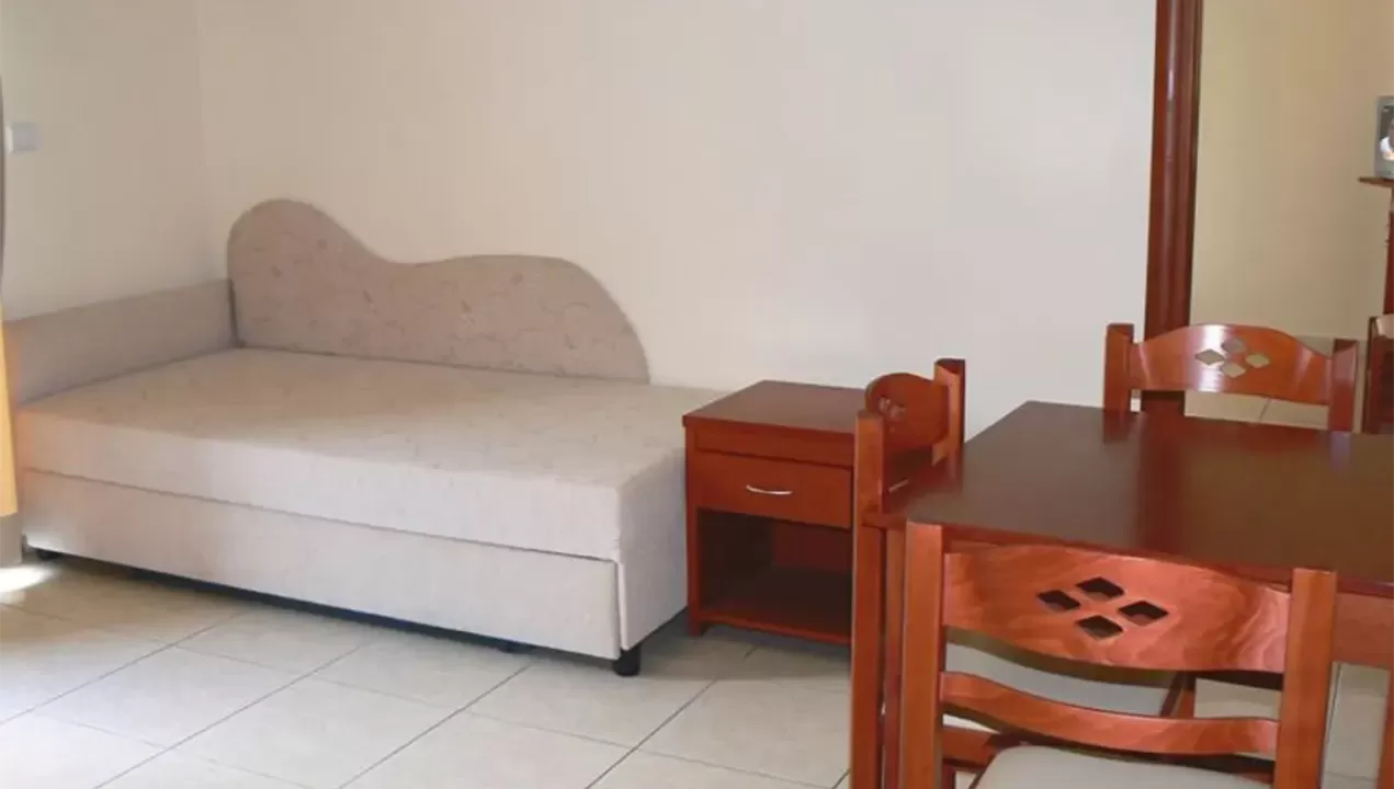 1/4 apartman - u jednoj prostoriji čajna kuhinja, u drugoj prostoriji jedan bračni ležaj, u trećoj prostoriji jedan bračni ležaj.U pojedinim slučajevima moguća su odstupanja mera ležaja od našeg standarda.Grčki standard za normalni ležaj je 185cm-200cm sa 75-90cm, a bračni ležaj (dve osobe) 185-200cm sa 120-155cm.