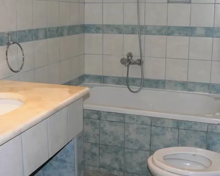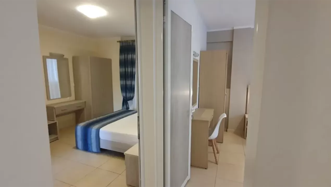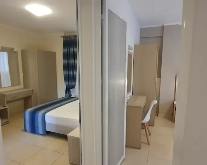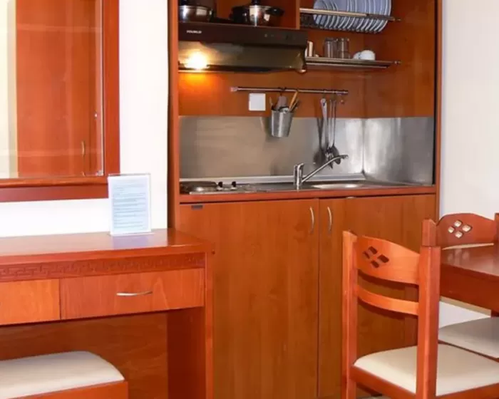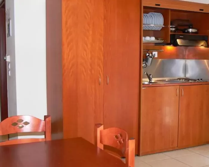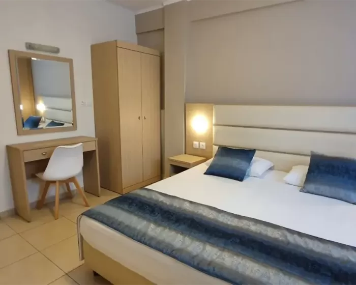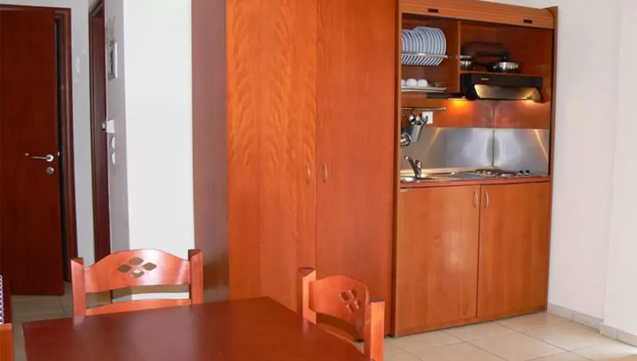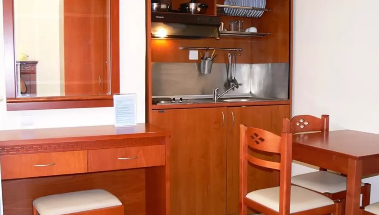 1/4 apartman - u jednoj prostoriji čajna kuhinja, u drugoj prostoriji jedan bračni ležaj, u trećoj prostoriji jedan bračni ležaj.U pojedinim slučajevima moguća su odstupanja mera ležaja od našeg standarda.Grčki standard za normalni ležaj je 185cm-200cm sa 75-90cm, a bračni ležaj (dve osobe) 185-200cm sa 120-155cm.