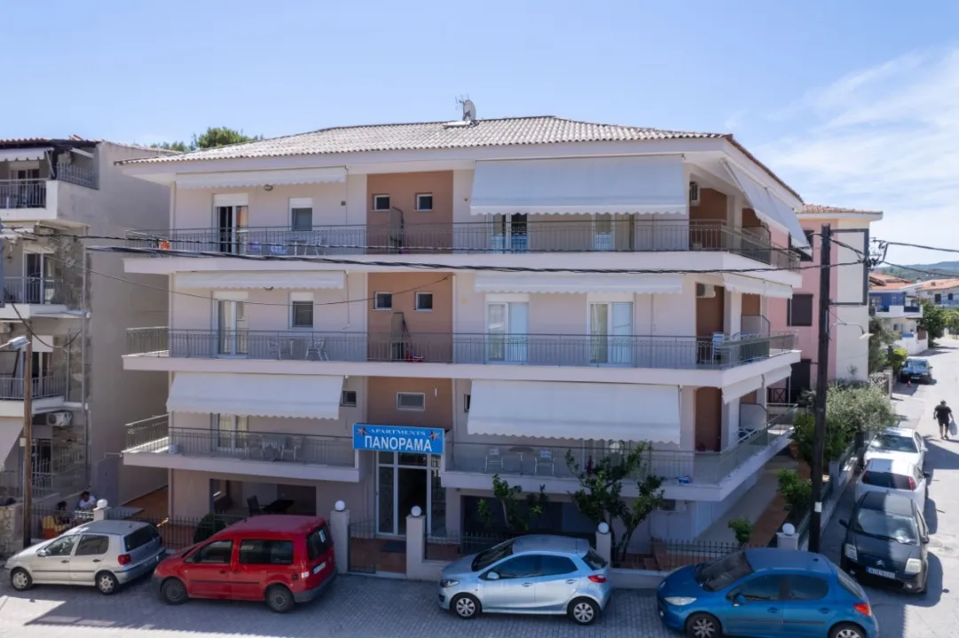 Vila Panorama 1 Hanioti se nalazi u blizini trga ovog popularnog letovališta, odmah iznad taxi stanice u glavnoj ulici, koja se spušta od magistrale ka centru letovališta. Od vile do uredje plaže ima ukupno 400 metara udaljenosti, a do plaže ase prolazi kroz sam centar, gde su svi turistički sadržaji: mega marketi, prodavnice, kafići, restorani i nezaobilazni giros. Vila se nalazi u mirnom delu Haniotija, kod mega-marketa, a ispred vile je javni parking prostor. Vila Panorama nudi i renovirane lux apartmane i duplexe, koji su posebno označeni u cenovniku.