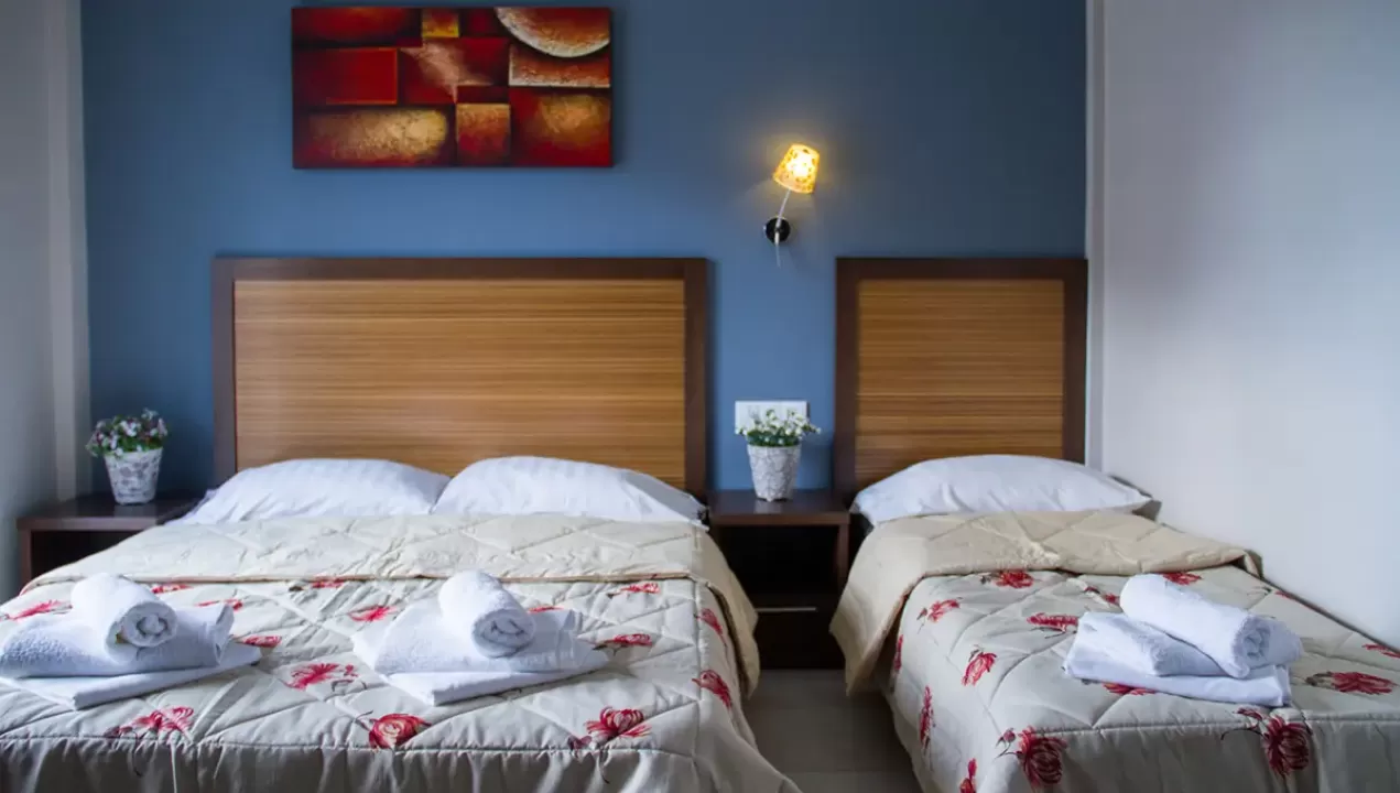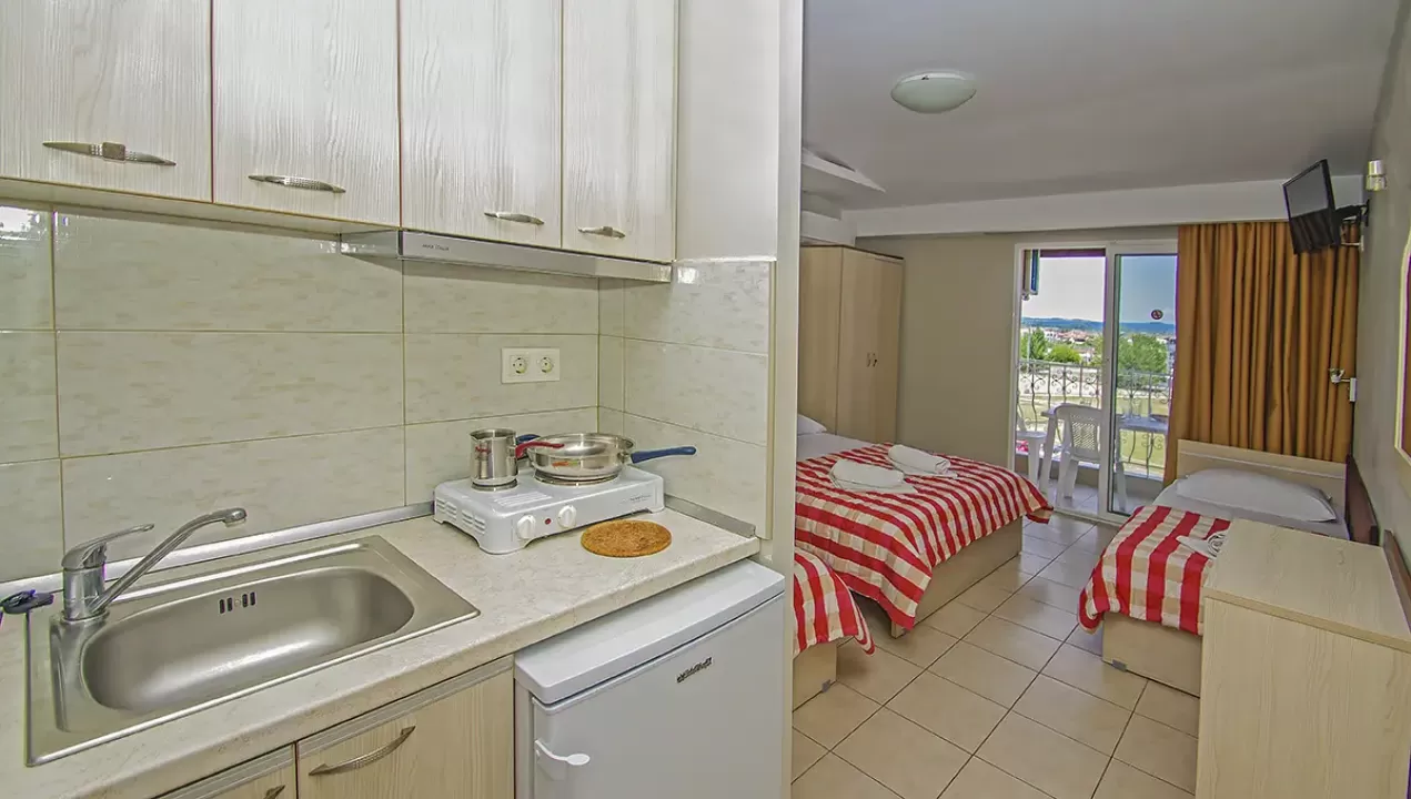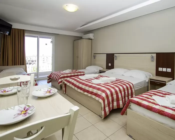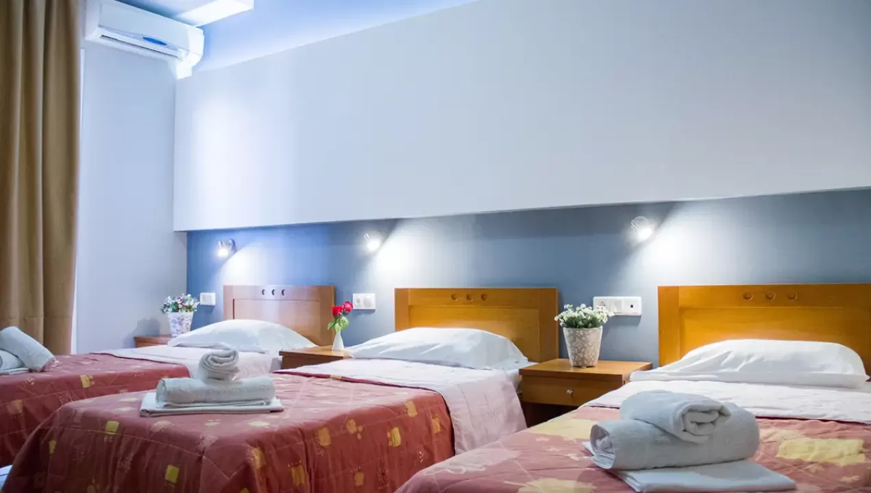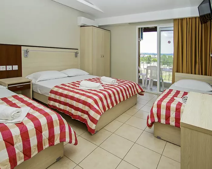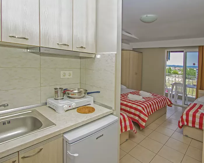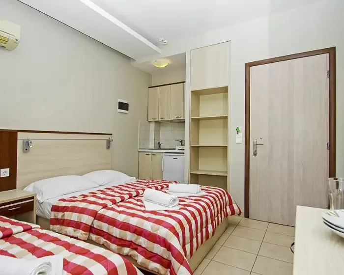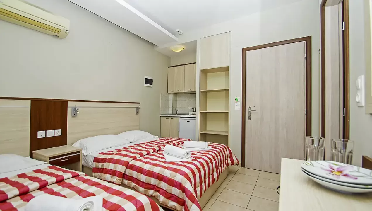 Tip smeštaja:1/2 studio - u jednoj prostoriji mini kuhinja i dva obična ležaja ili jedan bračni ležaj.1/2* studio - u jednoj prostoriji mini kuhinja i dva obična ležaja ili jedan bračni ležaj, terasa u sklopu studia pogled zid + odvojena terasa pogled ulica.1/3 studio - u jednoj prostoriji mini kuhinja i tri obična ležaja ili jedan bračni i jedan običan ležaj.1/4 studio - u jednoj prostoriji mini kuhinja jedan bračni i dva obična ležaja.U pojedinim slučajevima moguća su odstupanja mera ležaja od našeg standarda. Grčki standard za ležaj je 185 cm sa 75-80 cm, a bračni ležaj (dve osobe) 185-200 cm sa 120-155 cm. Tuš kabina u prizemlju i veliki pokriveni prostor ispred objekta.