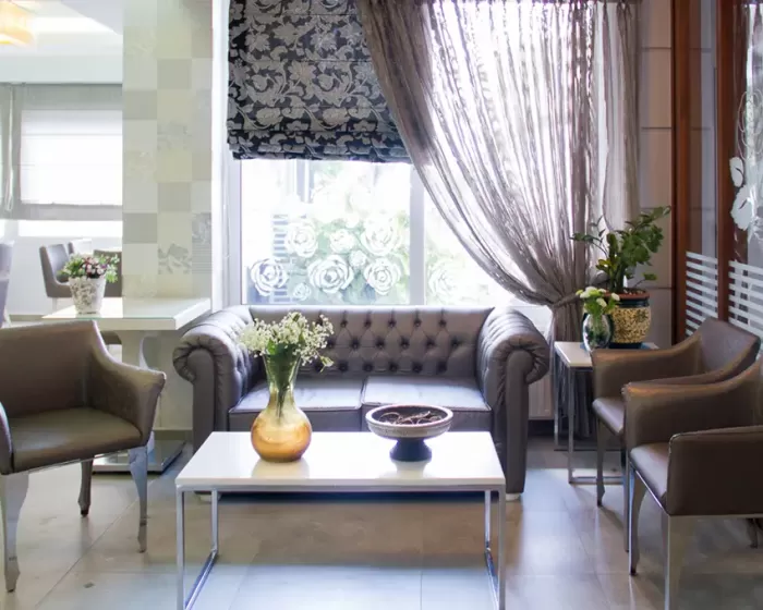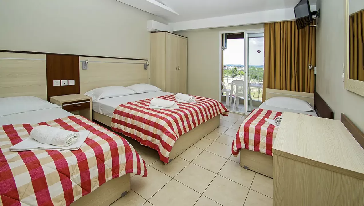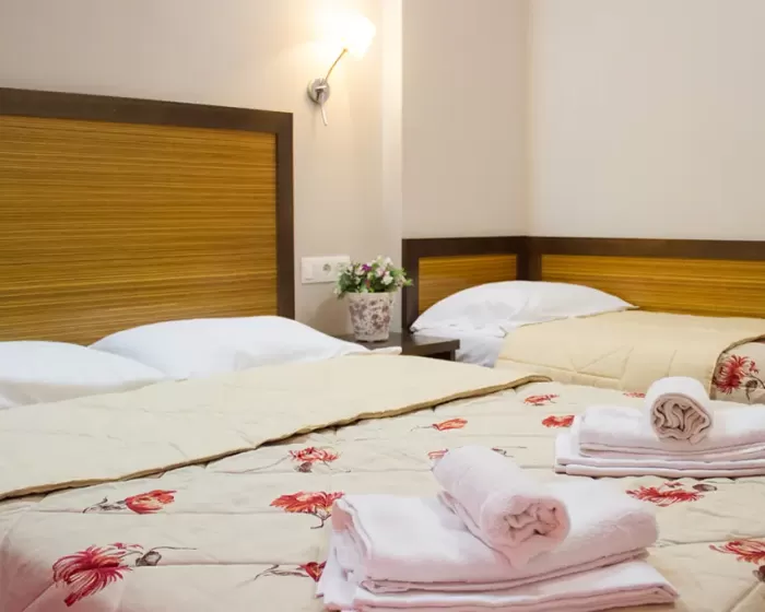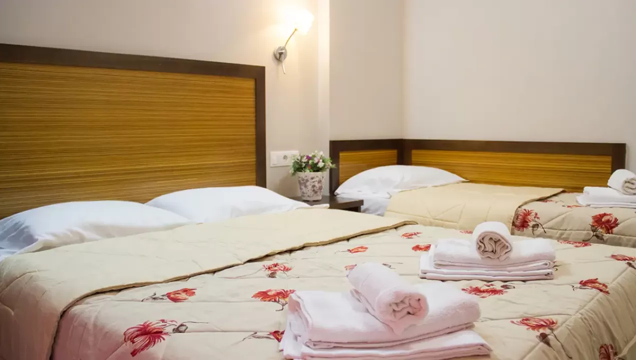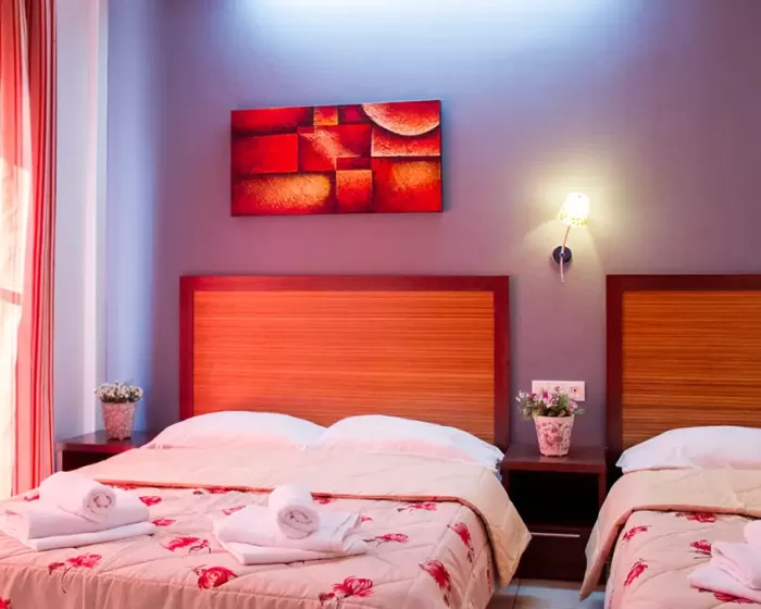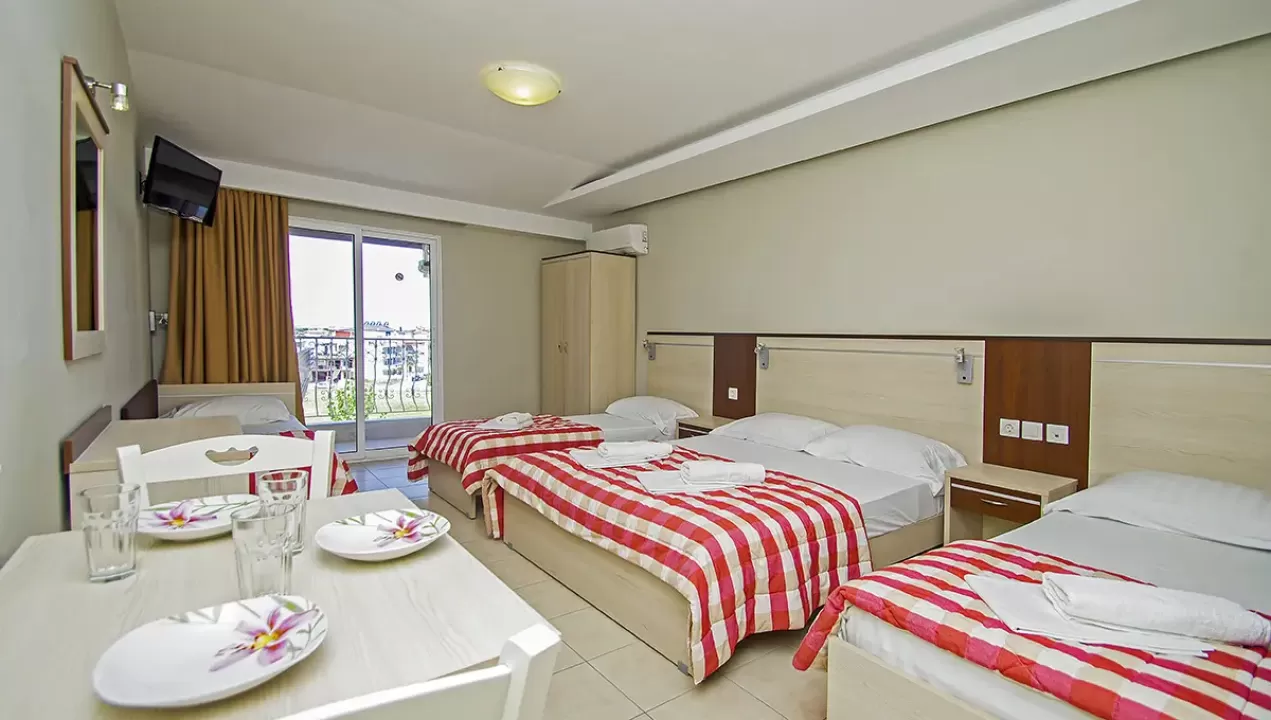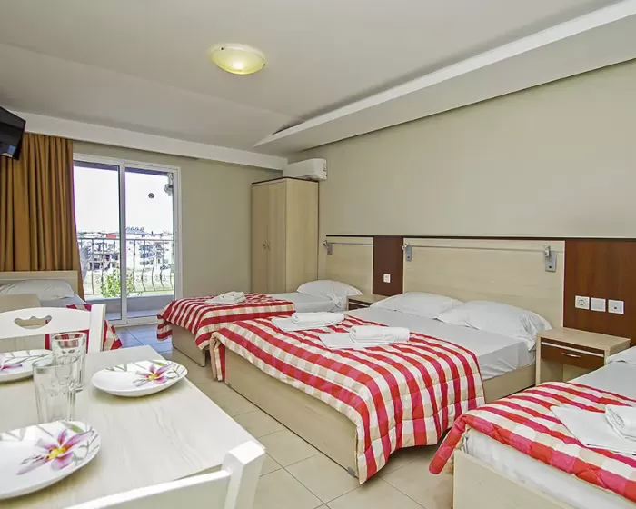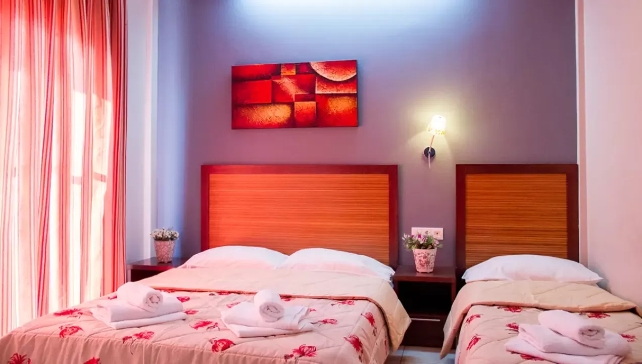 Tip smeštaja:1/2 studio - u jednoj prostoriji mini kuhinja i dva obična ležaja ili jedan bračni ležaj.1/2* studio - u jednoj prostoriji mini kuhinja i dva obična ležaja ili jedan bračni ležaj, terasa u sklopu studia pogled zid + odvojena terasa pogled ulica.1/3 studio - u jednoj prostoriji mini kuhinja i tri obična ležaja ili jedan bračni i jedan običan ležaj.1/4 studio - u jednoj prostoriji mini kuhinja jedan bračni i dva obična ležaja.U pojedinim slučajevima moguća su odstupanja mera ležaja od našeg standarda. Grčki standard za ležaj je 185 cm sa 75-80 cm, a bračni ležaj (dve osobe) 185-200 cm sa 120-155 cm. Tuš kabina u prizemlju i veliki pokriveni prostor ispred objekta.