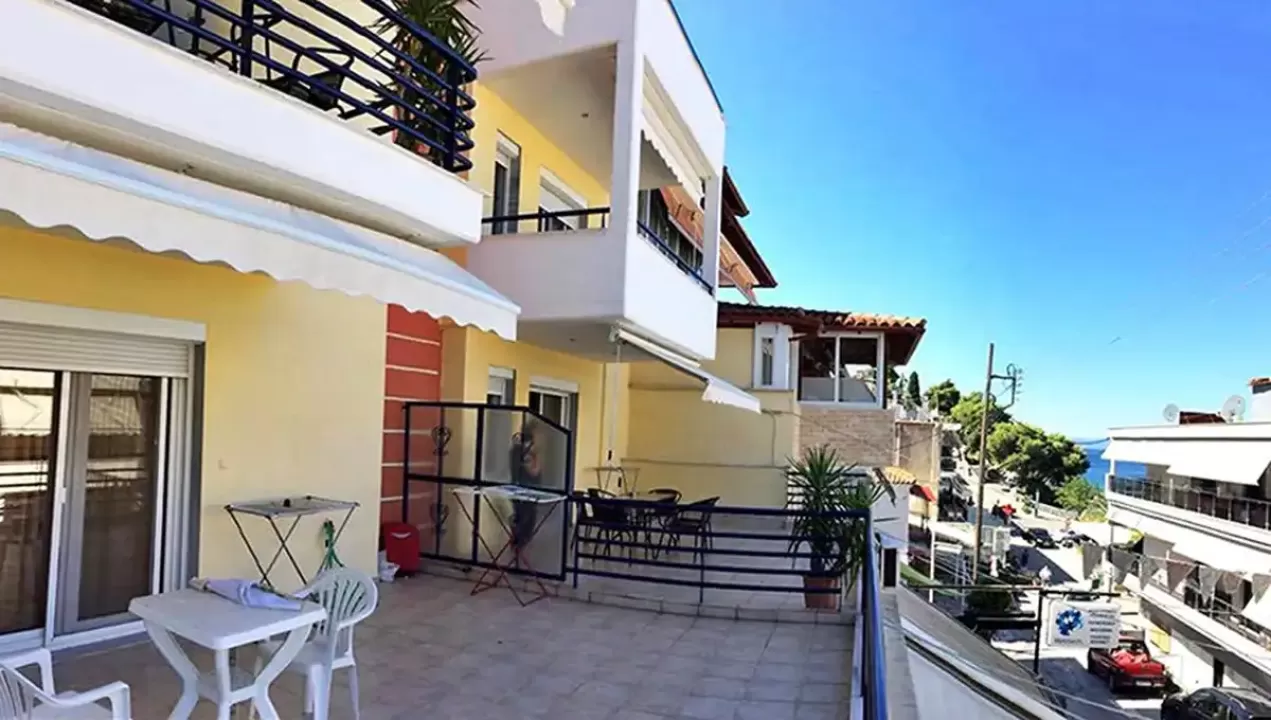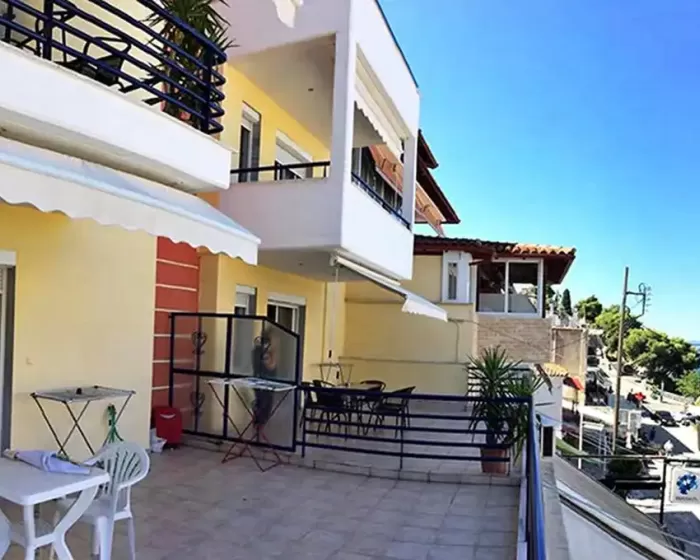Vila Stratos Neos Marmaras se nalazi u centralnom delu letovališta, kod trga sa fontanom. Od mora je udaljena oko 60 metara, do se gradska plaža nalazi na udaljenosti od 500 metara. Sve smeštajne jedinice, nalaze se na prvom i drugom spratu vile.  U neposrednoj blizini vile nalaze se svi neophodni turistički sadržaji.