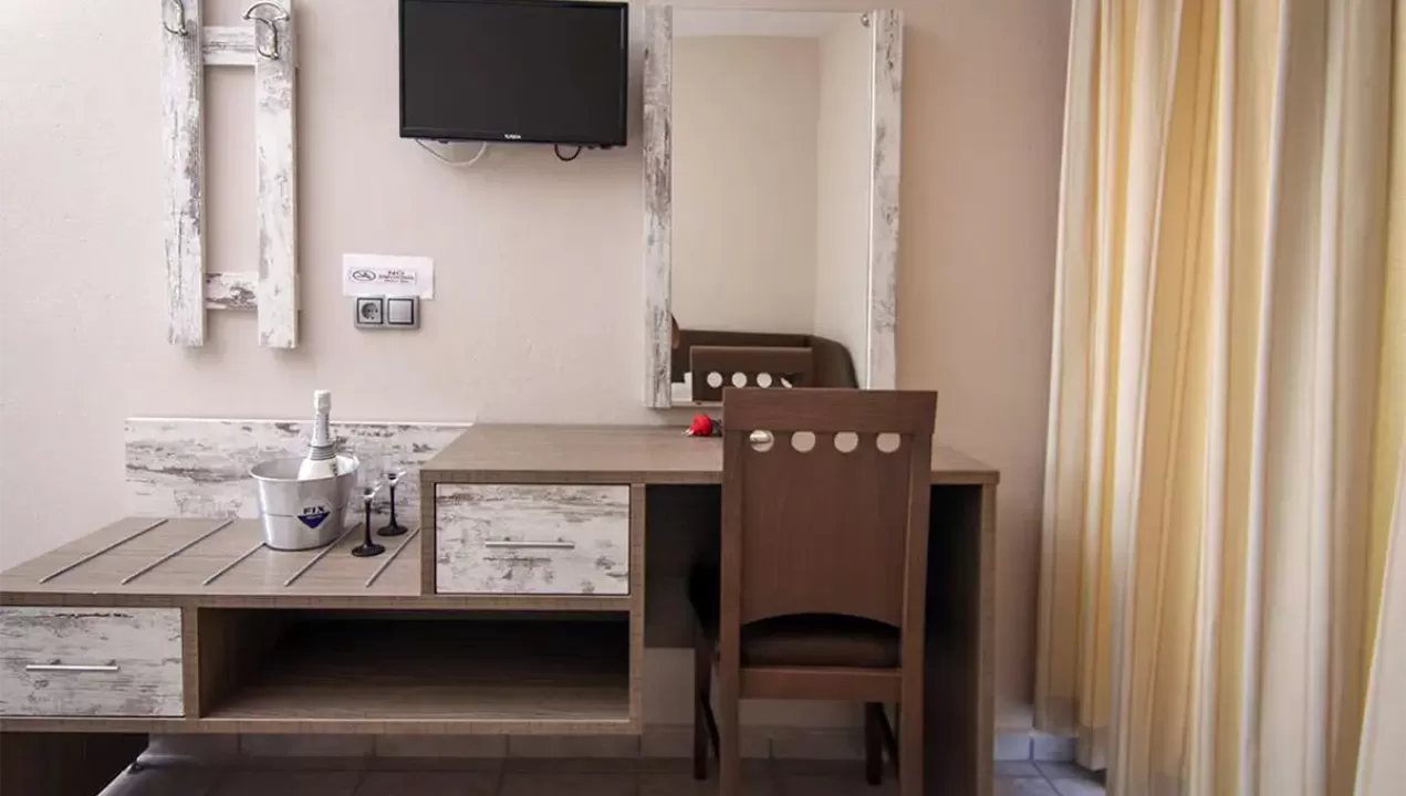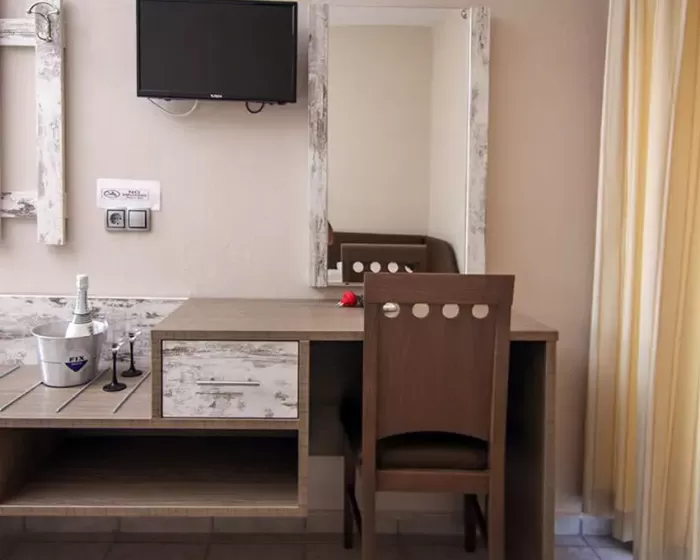 kupatili, peškiri, osnovno opremljena mini-kuhinja, klima-uredjaj, sef, telefon, terasa sa garniturom za sedenje