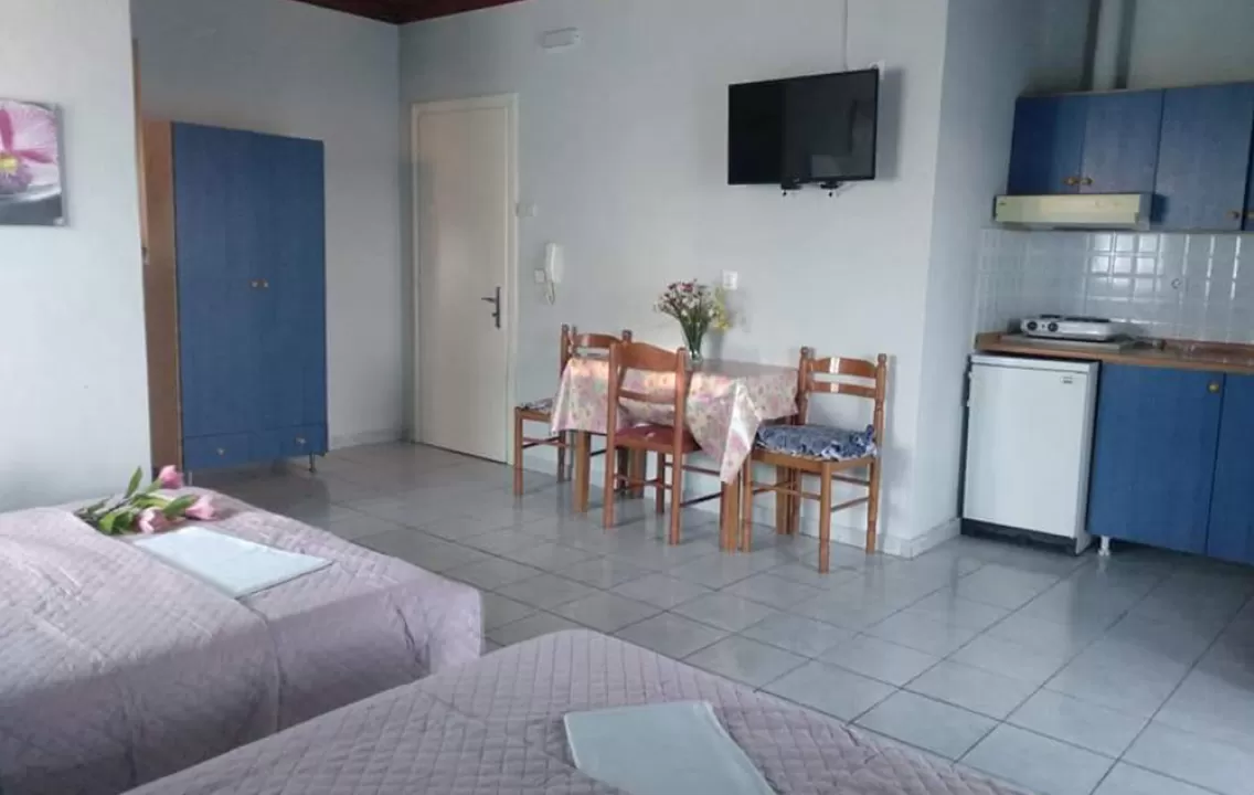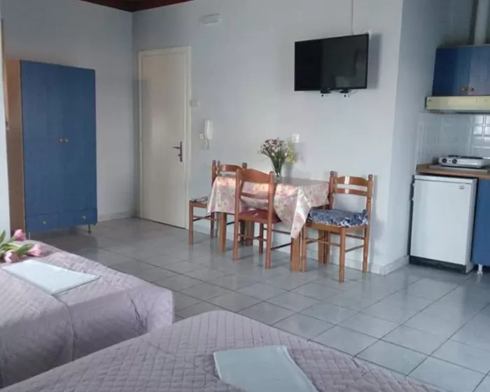 Vila Tula Stavros se nalazi u centralnom delu Stavrosa, u blizini šetališta, a od plaže je udaljena 300m. U blizini vile su brojne prodavnice, pekare, supermarketi.Svaki studio ima opremljen kuhinjski deo, kupatilo/wc, terasu, WiFi i klima uređaj.