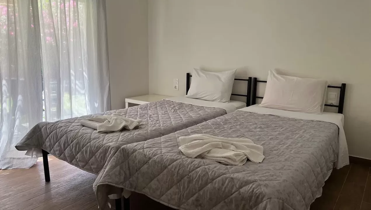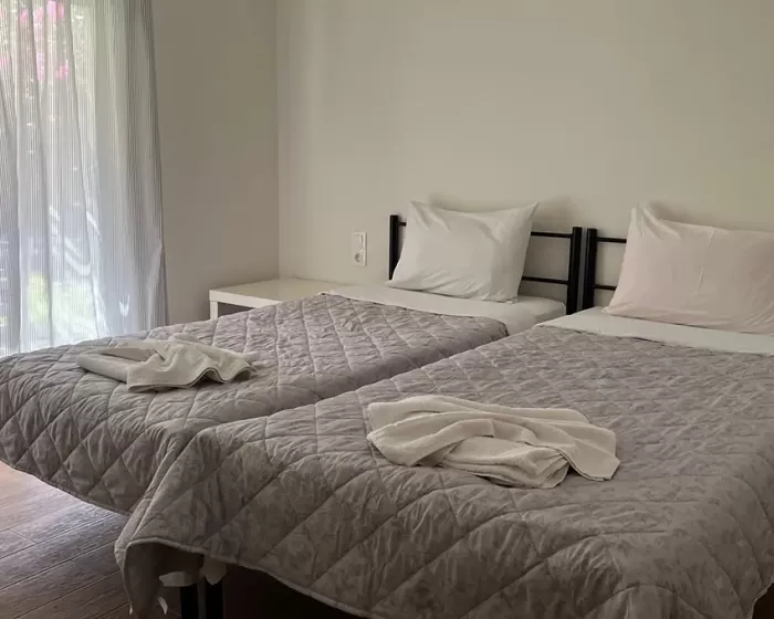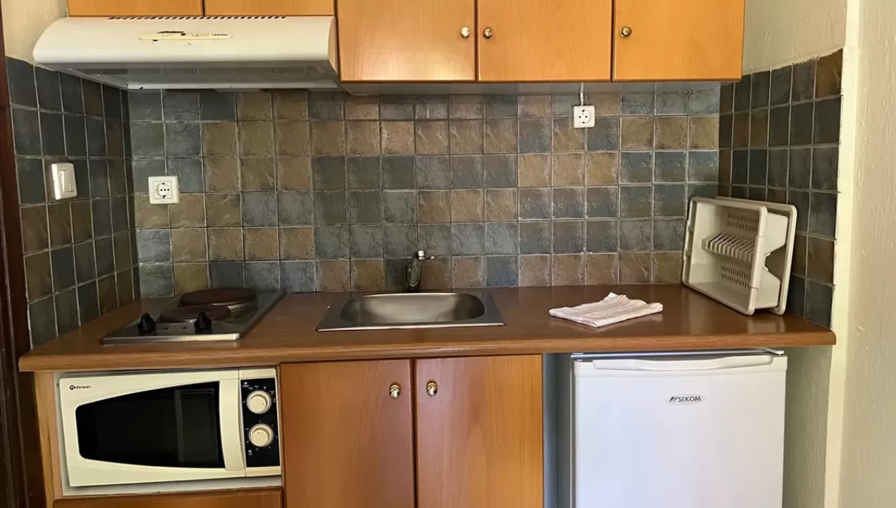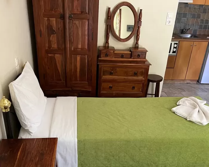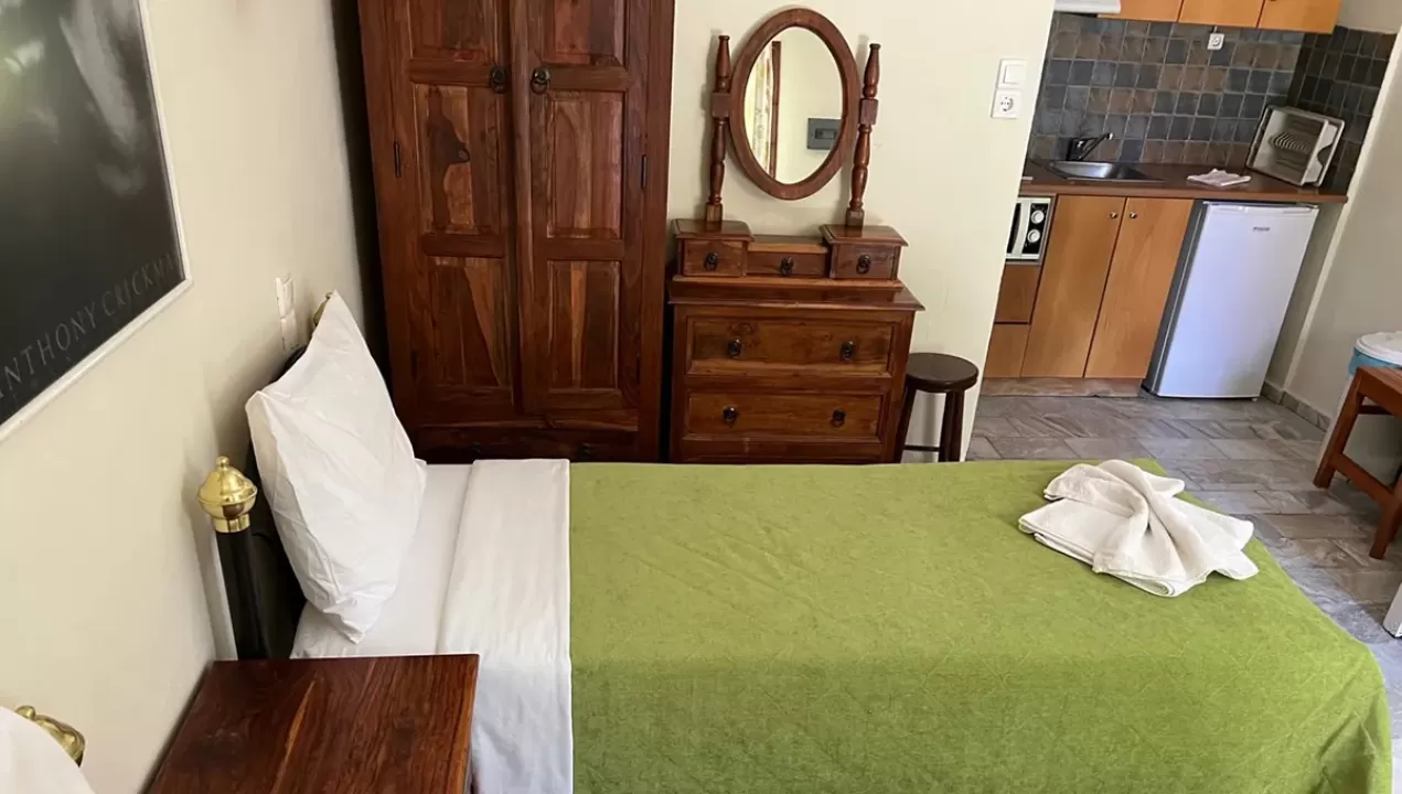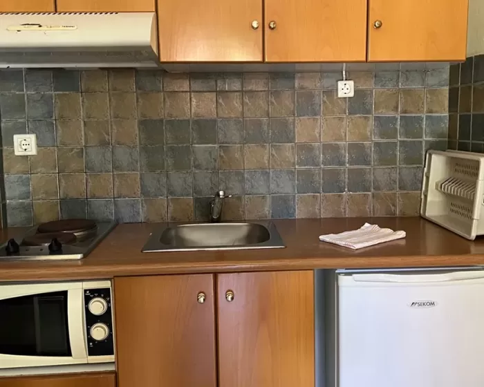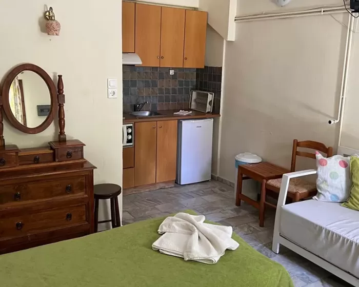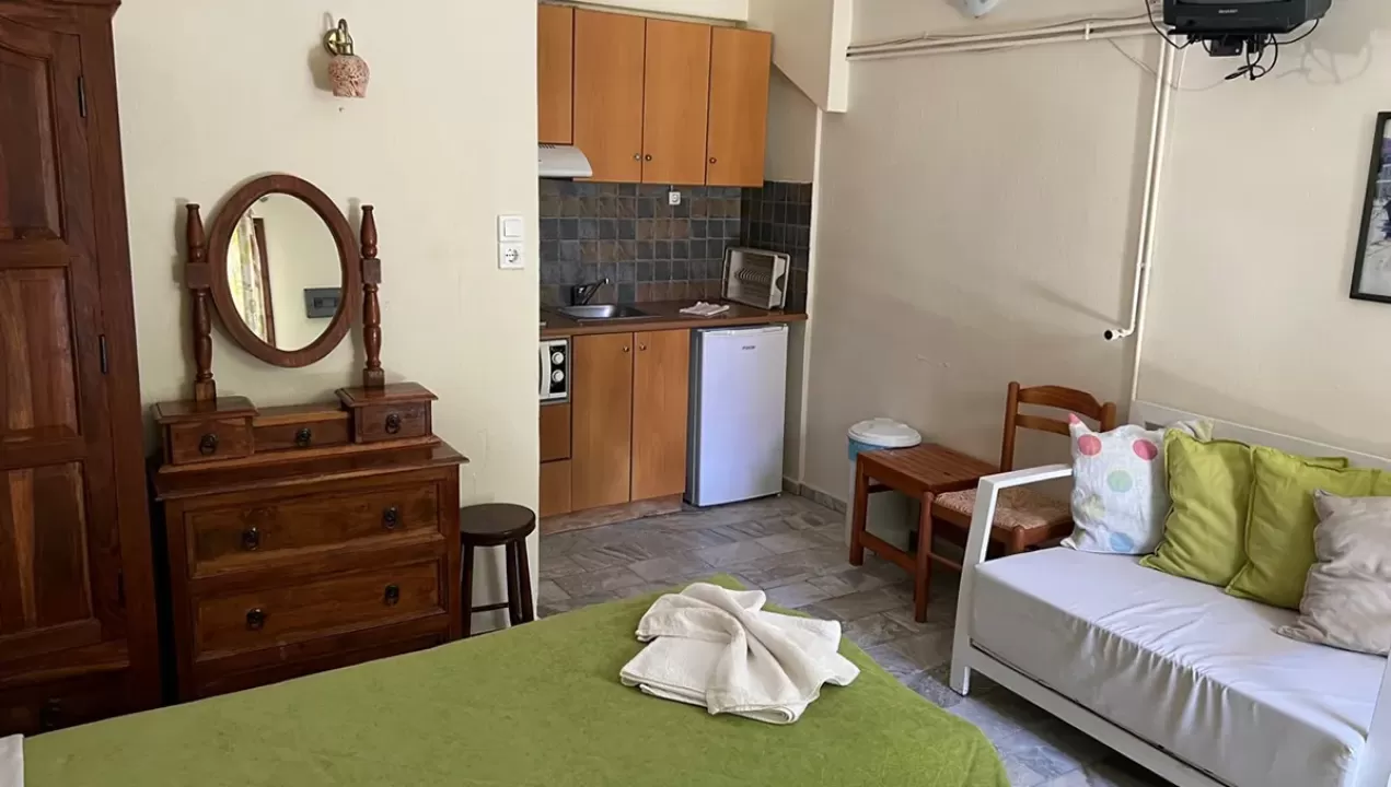 Tip smeštaja:1/2 studio: dvokrevetni studiji se nalaze u glavnoj zgradi i u bungalovima, i sastoje se od dva singl ležaja ili Francuskog ležaja, jedan ili dva noćna stočića pored kreveta, orman, veliki sto sa ogledalom, klima uređaj, TV i kuhinjskog dela koji se sastoji od rešoa sa dve ringle, mikrotalasnom pećnicom i aspiratorom, kao i priborom za ručavanje za dve osobe. Svaki studio poseduje svoje kupatilo sa kadicom i tuš zavesom. Ispred studija se nalazni zaseban terasni deo sa stolom i dve stolice.