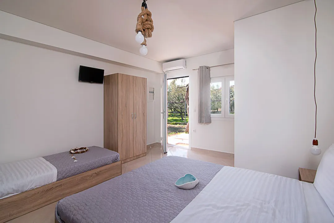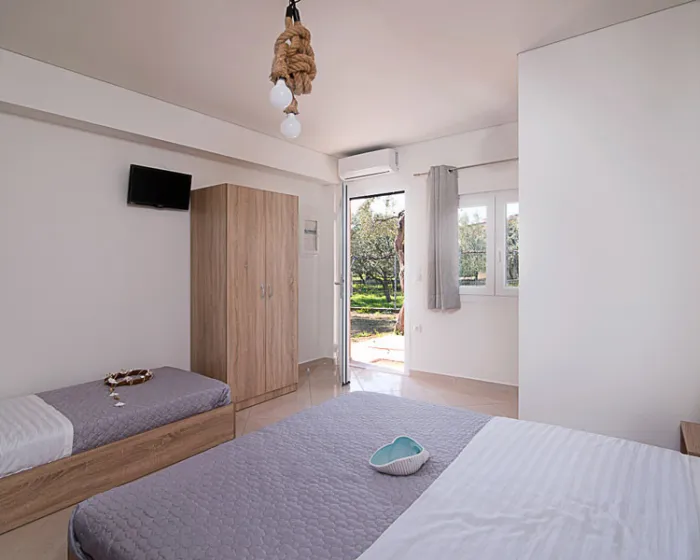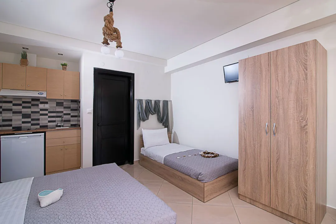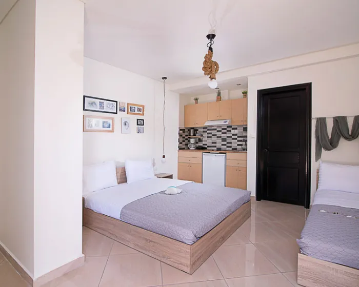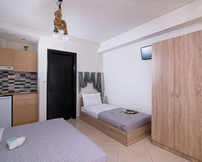 Trokrevetni studio (1/3 std) – jedna prostorija sa francuskim ležajam i jednim singl ležajem, kuhinja u okviru iste prostorije, kupatilo
