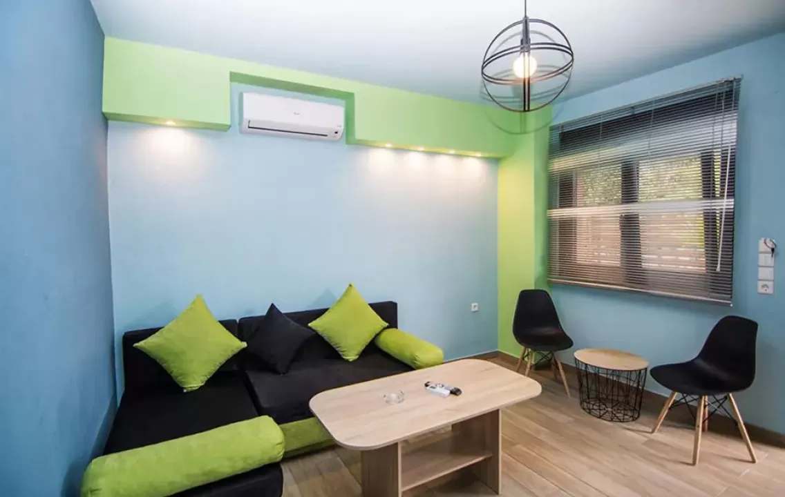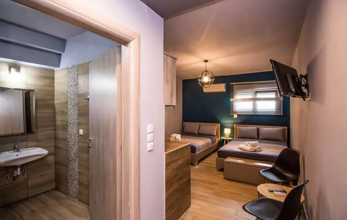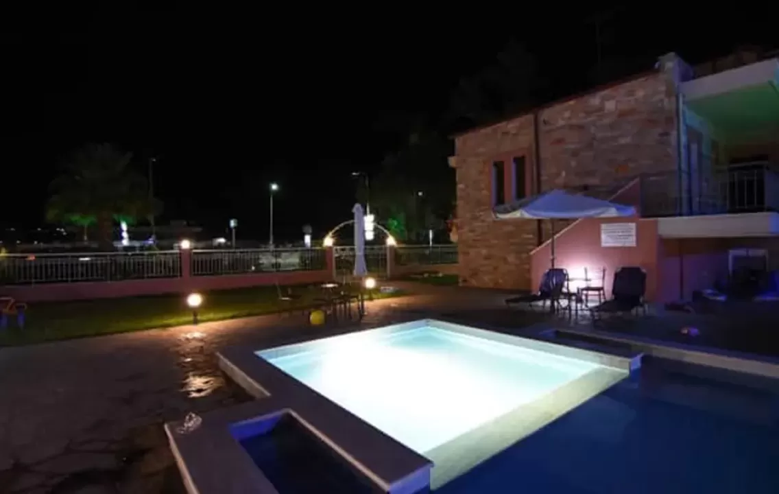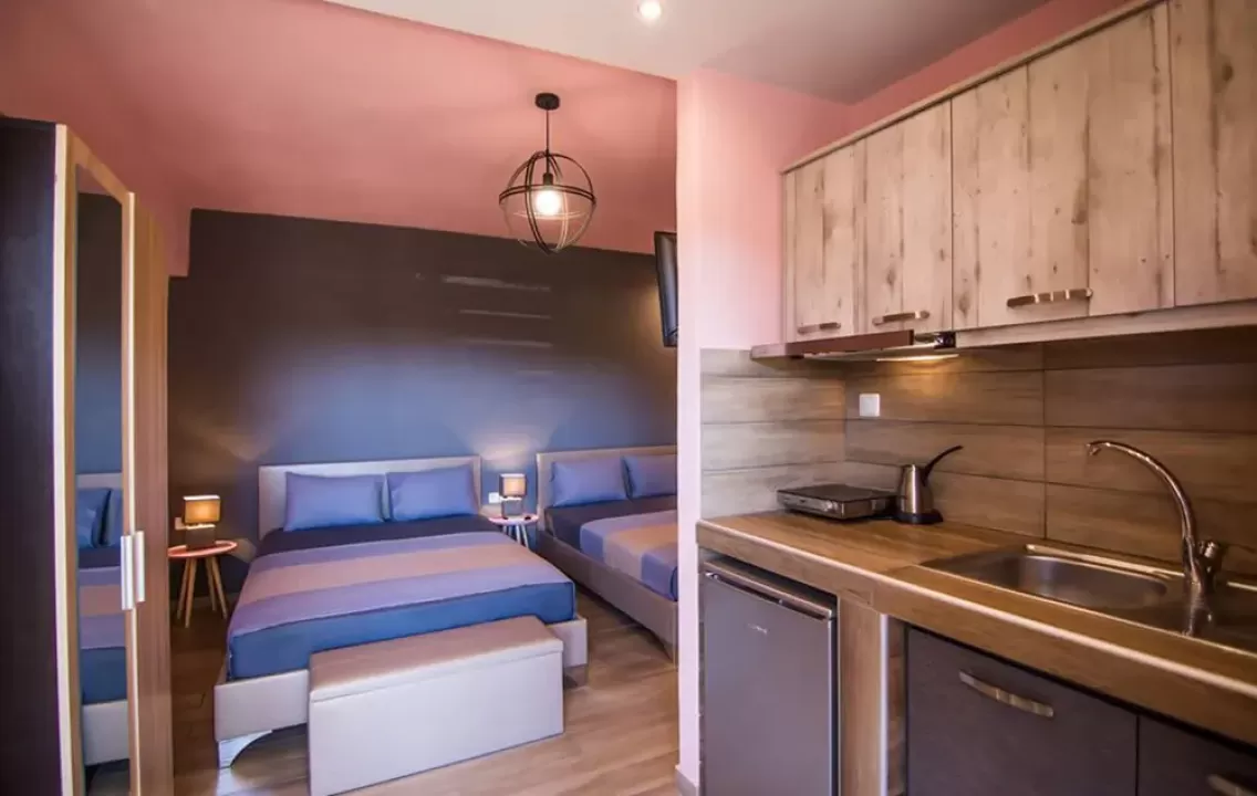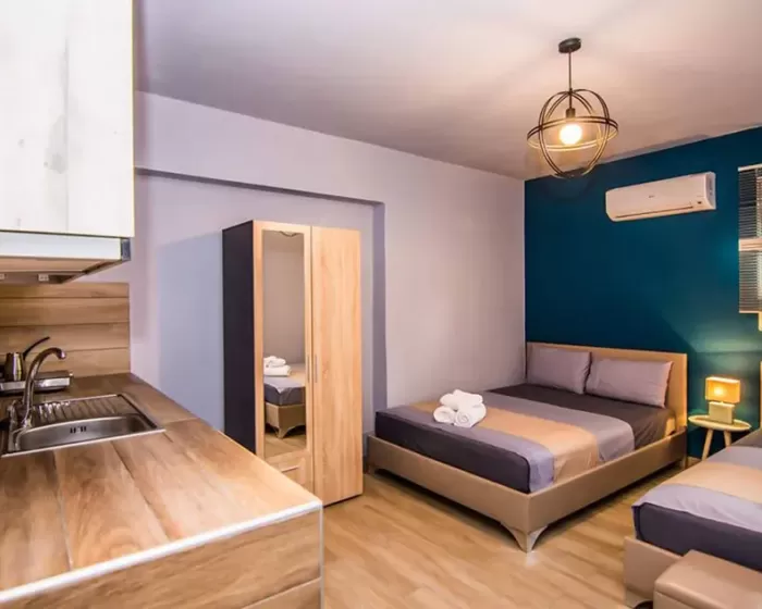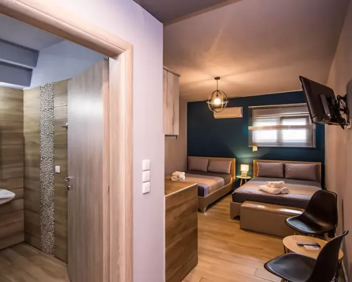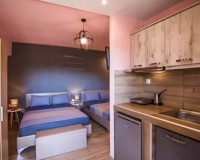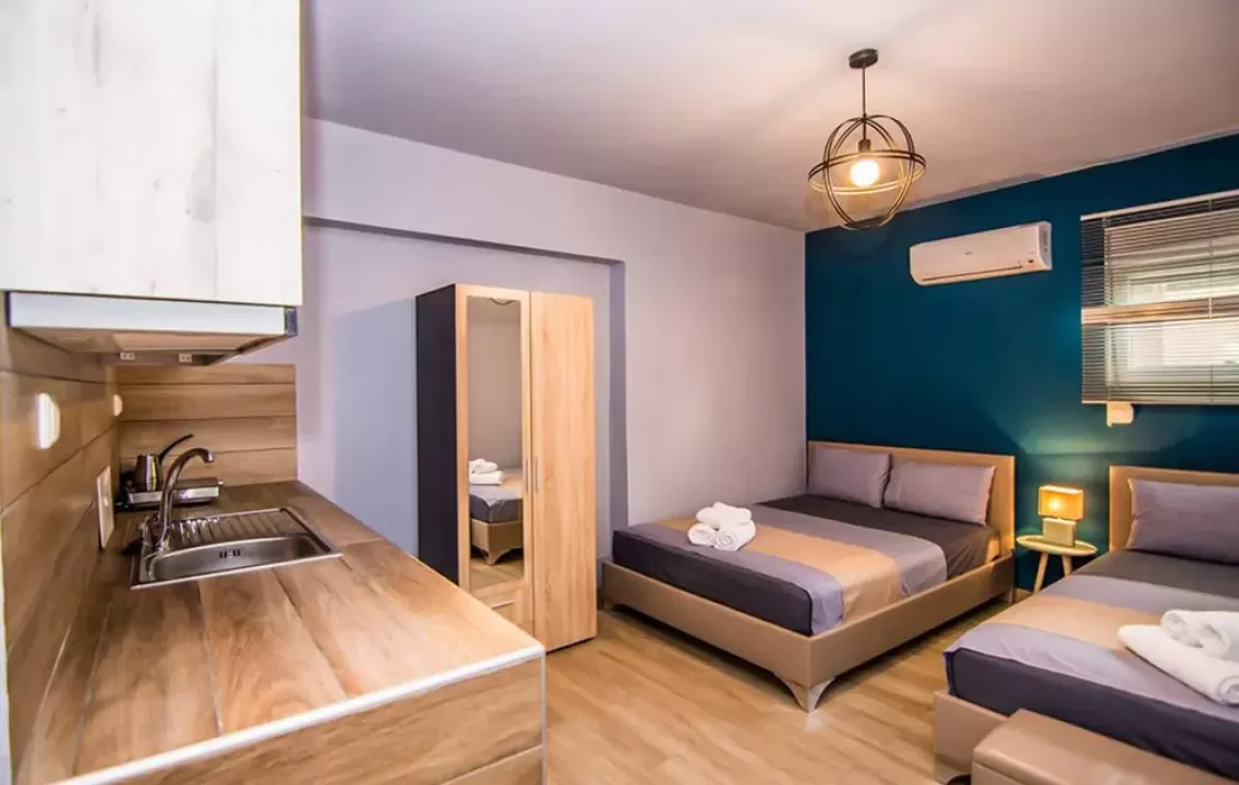 Nalazi se na glavnom putu kroz Nea Vrasnu, a preko puta velikih super marketa. Poseduje dvokrevetne, trokrevetne, četvorokrevetne i petokrevetne studije, kao i četvorokrevetne i petokrevetne apartmane koji se nalaze u prizemlju ili na prvom spratu.