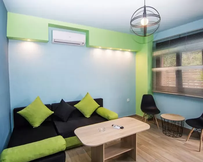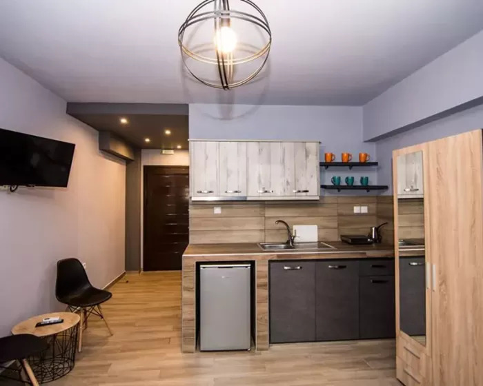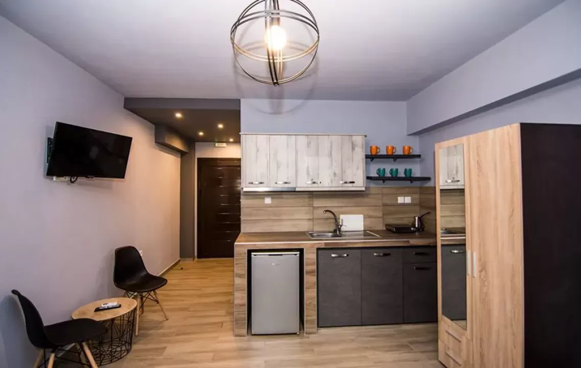 kupatilo, opremljena mini kuhinja, frižider, klima-uredjaj, TV, terasa sa garniturom za sedenje