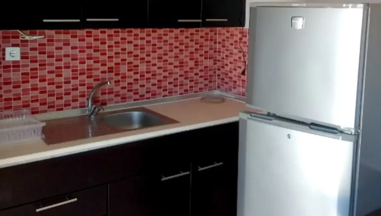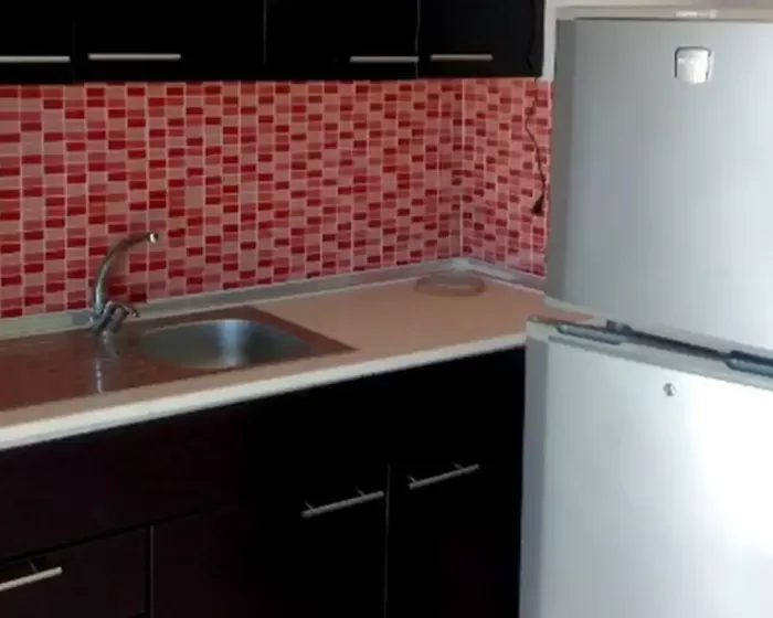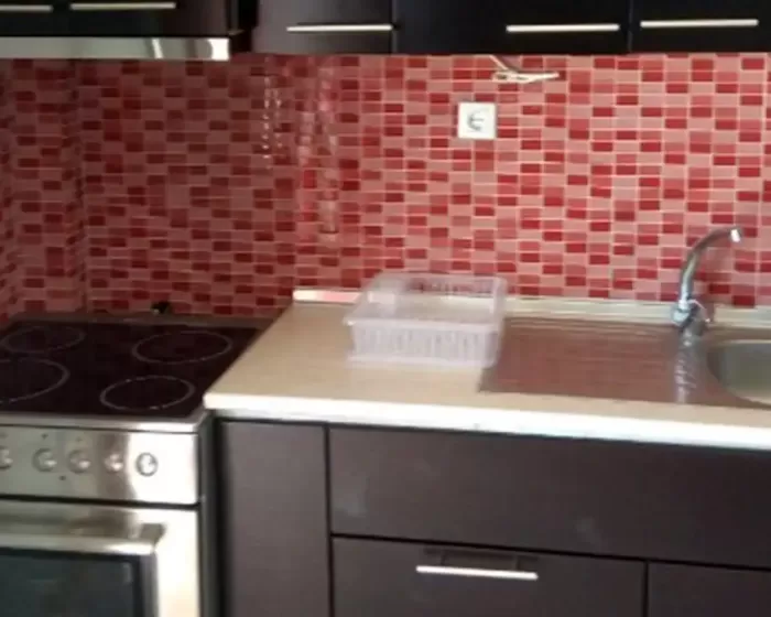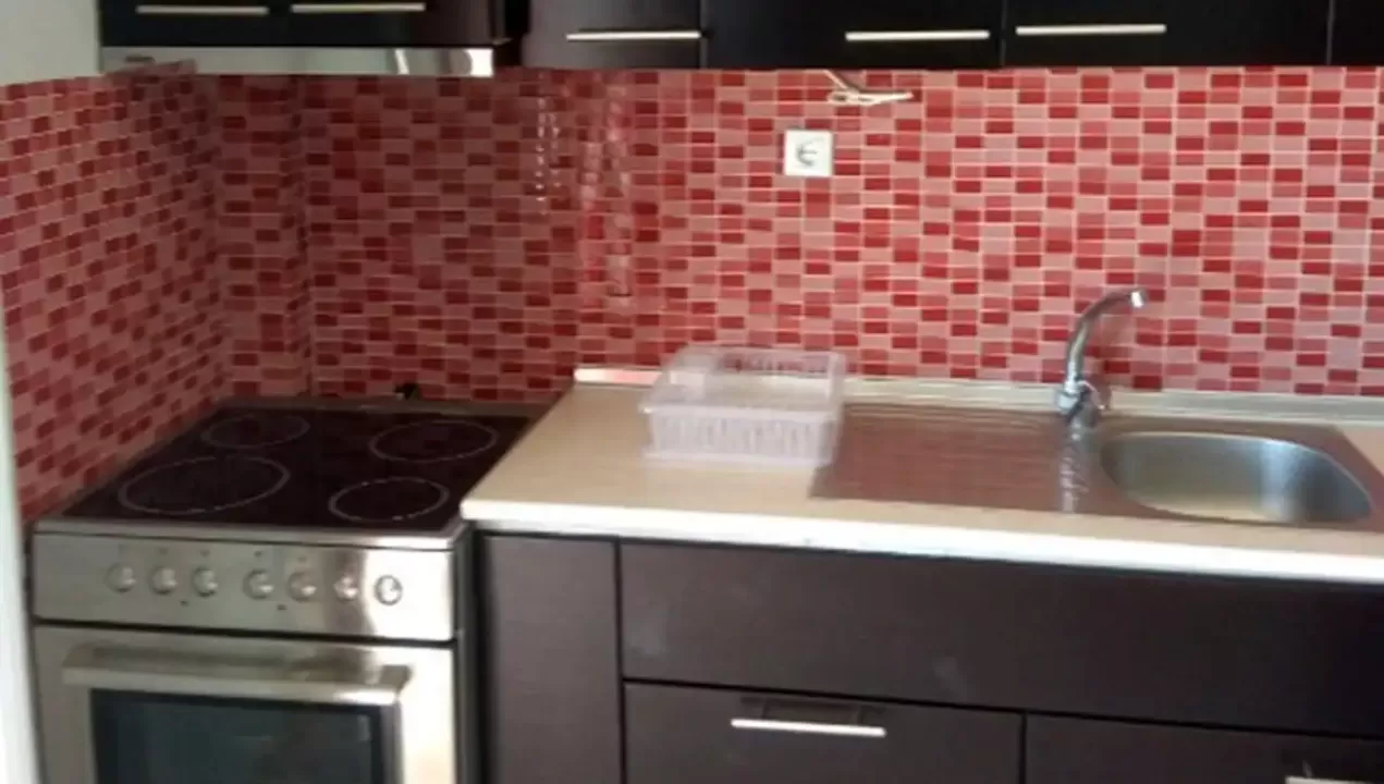 Kuhinjski deo sadrži veliki šporet, frižider, sudoperu i elemente sa osnovnim kuhinjskim inventarom.