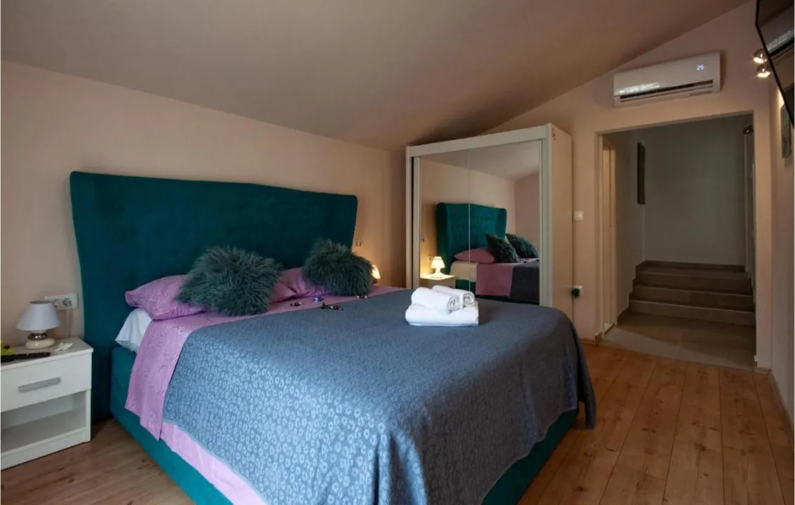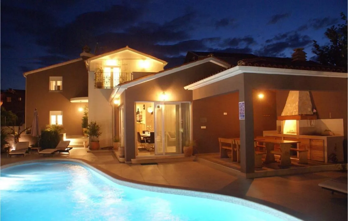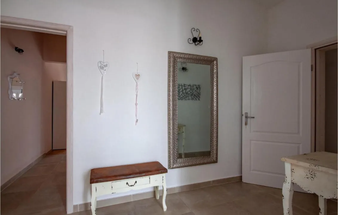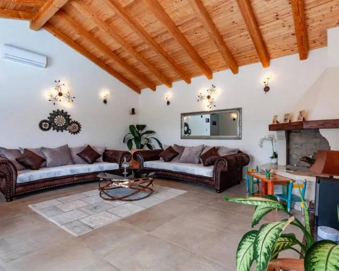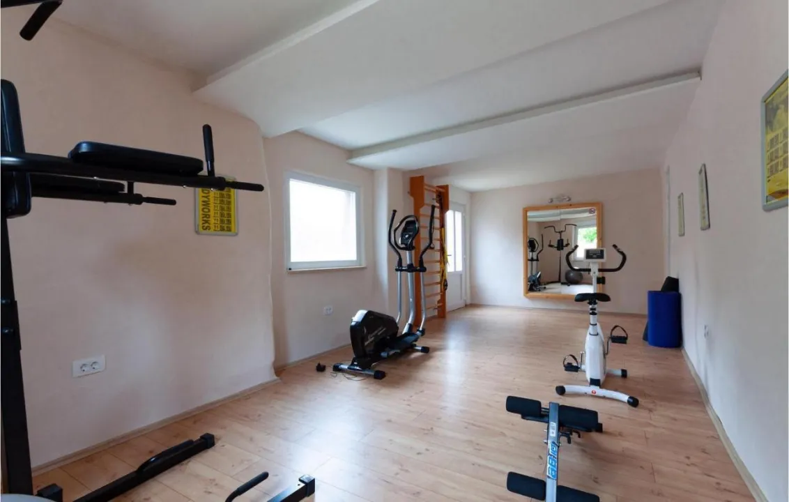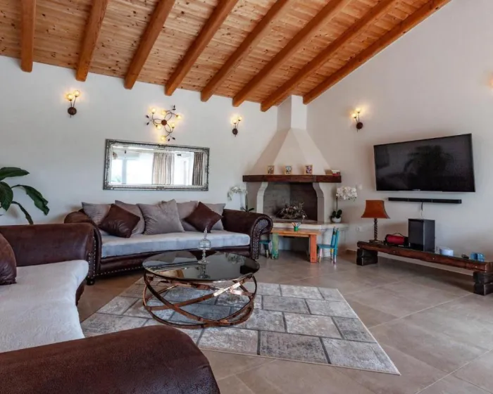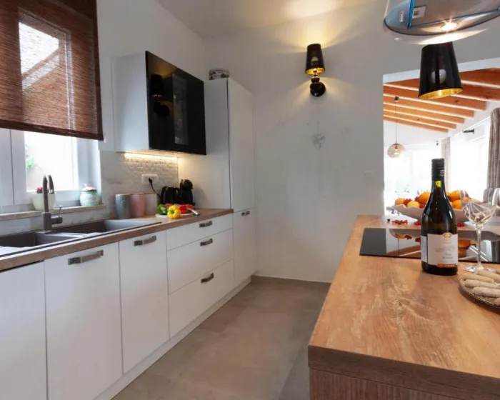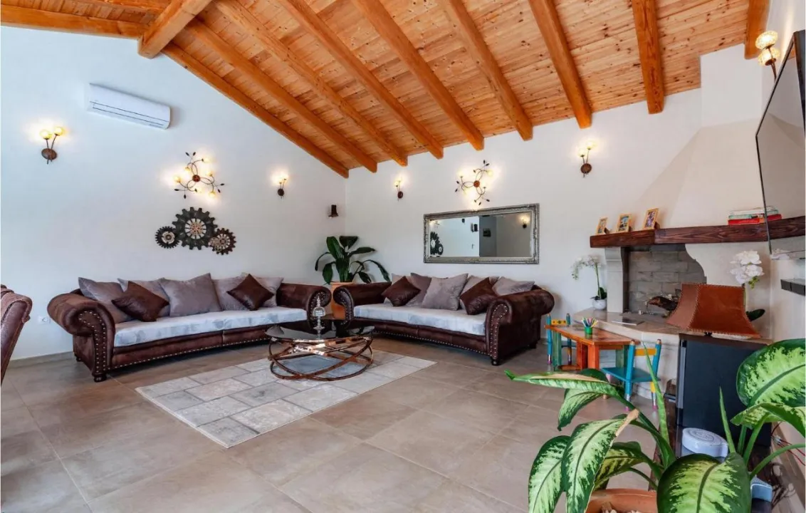 Prostrana kuća za odmor ima 5 odvojenih spavaćih soba, 5 kupatila, potpuno opremljenu kuhinju sa trpezarijom i mašinom za pranje posuđa, kao i dnevni boravak sa TV-om. smeštaj ima i kamin.