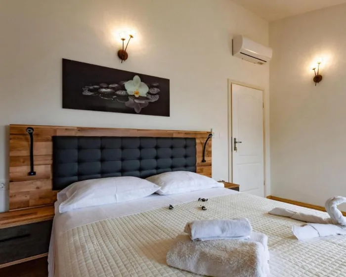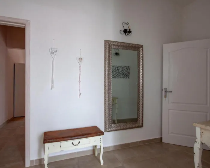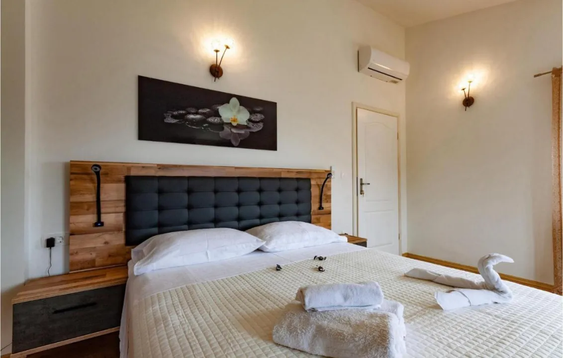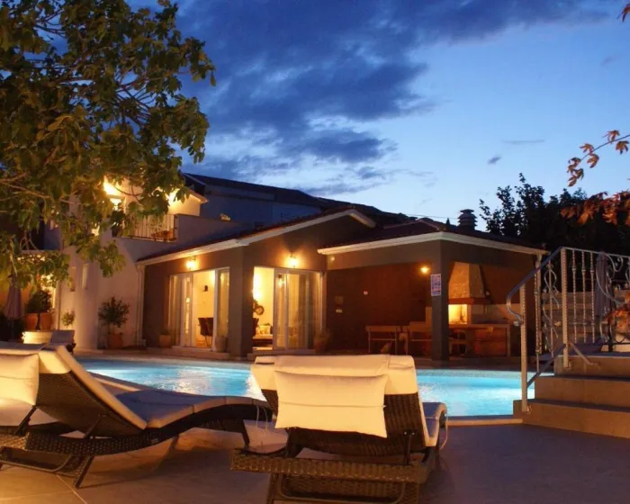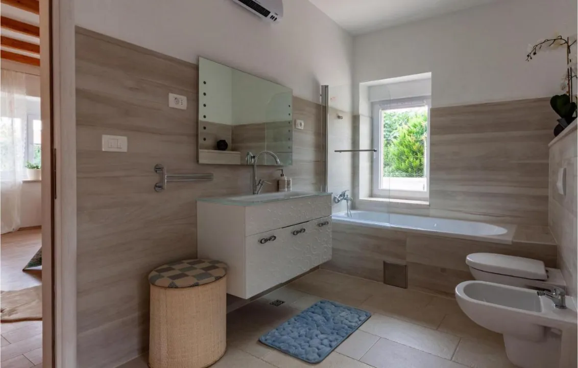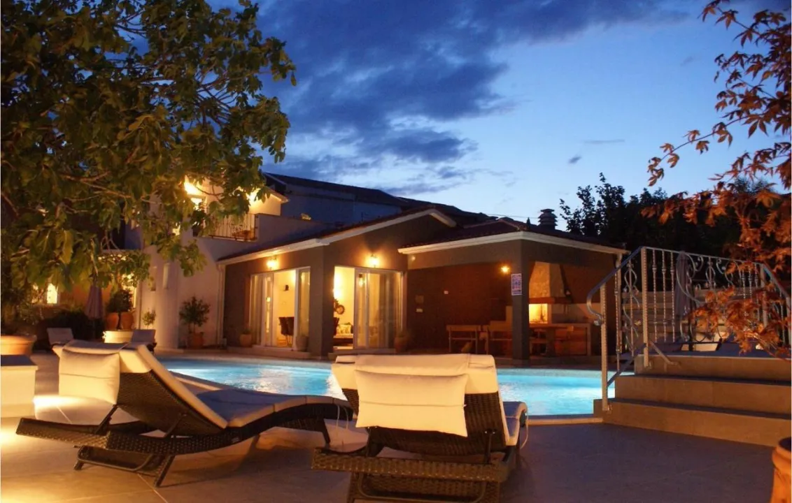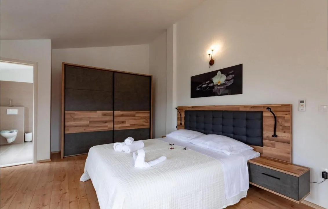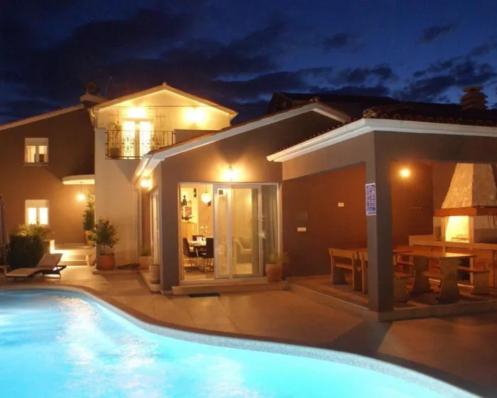 Prostrana kuća za odmor ima 5 odvojenih spavaćih soba, 5 kupatila, potpuno opremljenu kuhinju sa trpezarijom i mašinom za pranje posuđa, kao i dnevni boravak sa TV-om. smeštaj ima i kamin.