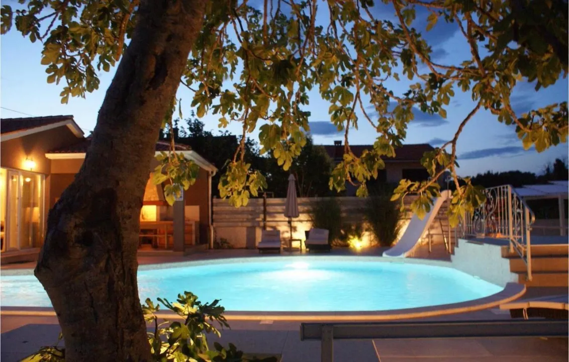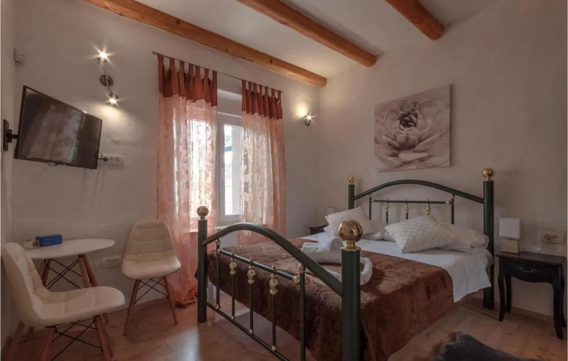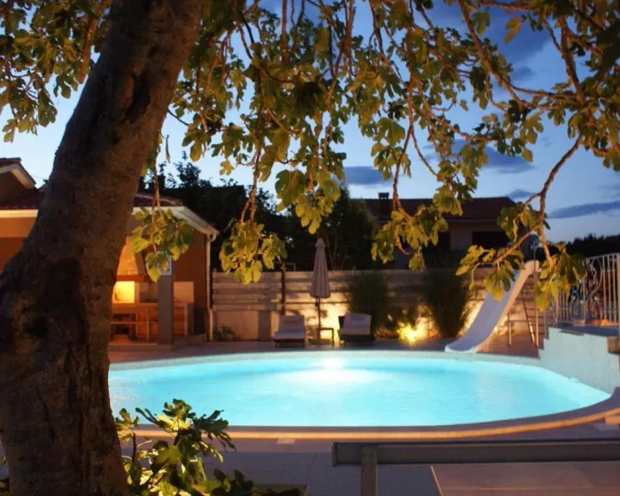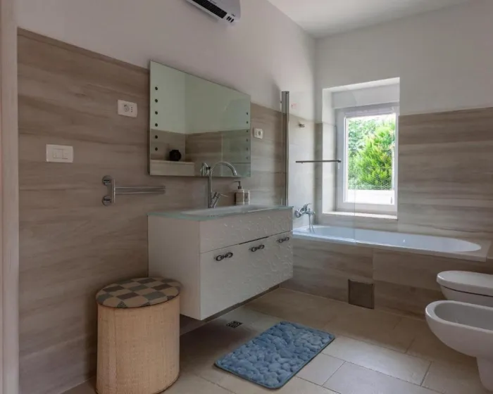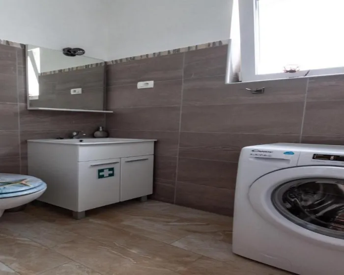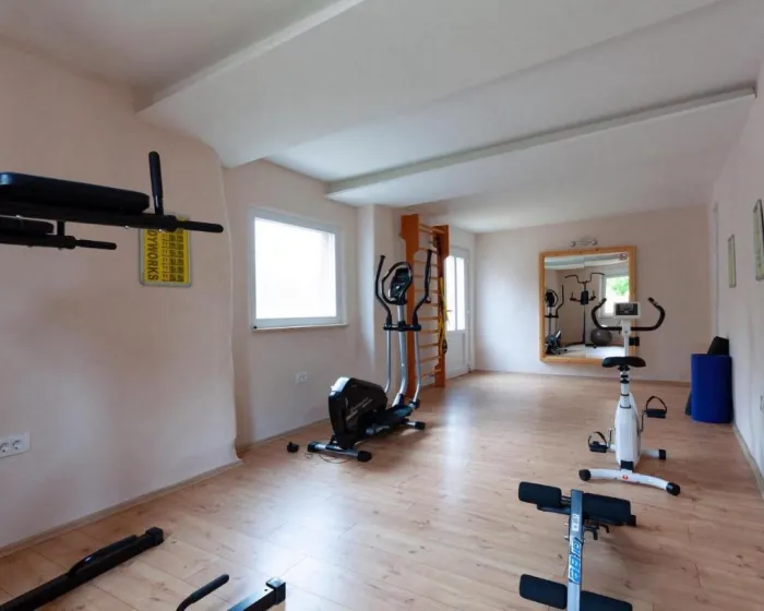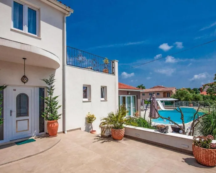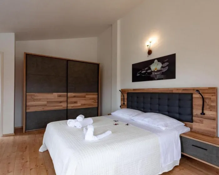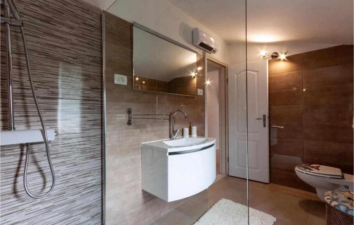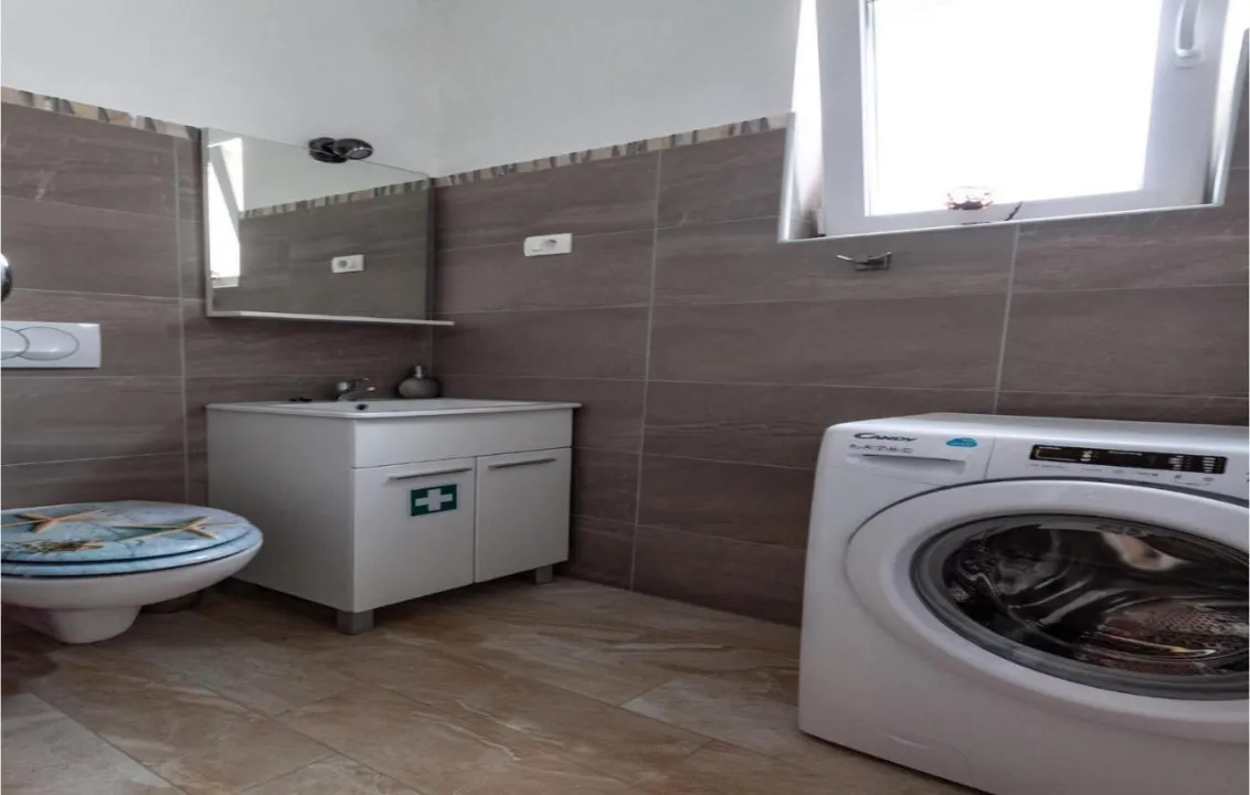 Prostrana kuća za odmor ima 5 odvojenih spavaćih soba, 5 kupatila, potpuno opremljenu kuhinju sa trpezarijom i mašinom za pranje posuđa, kao i dnevni boravak sa TV-om. smeštaj ima i kamin.