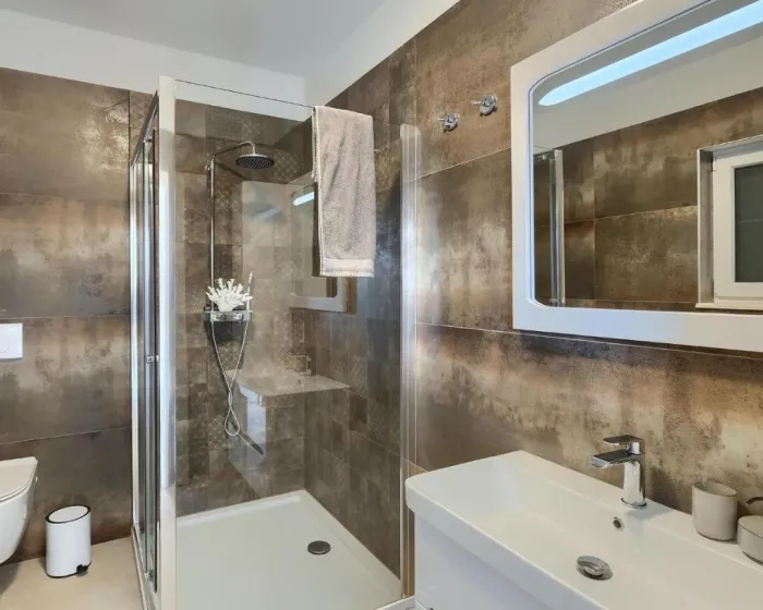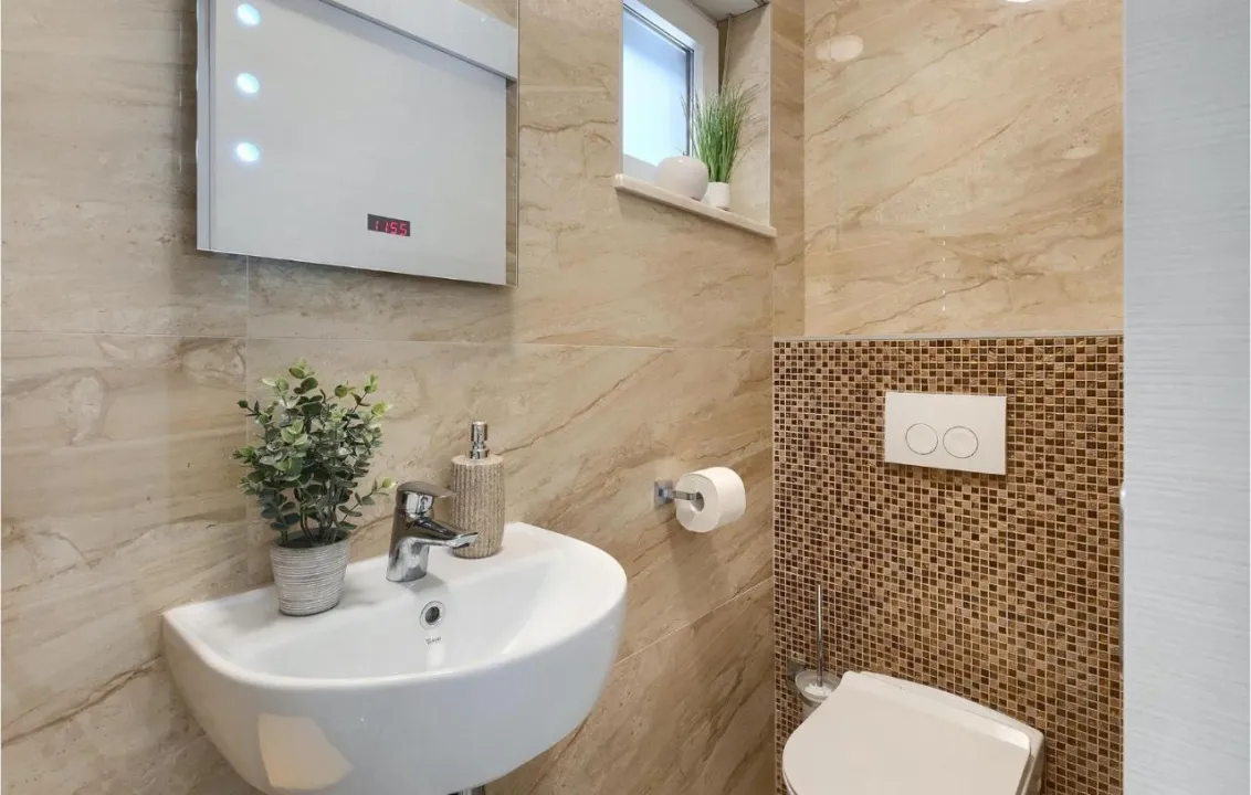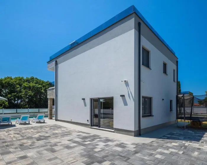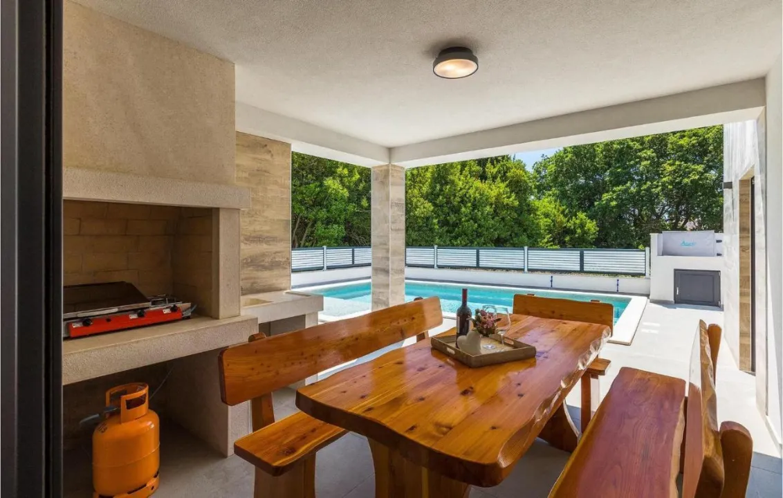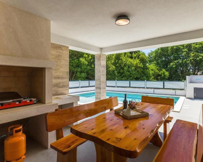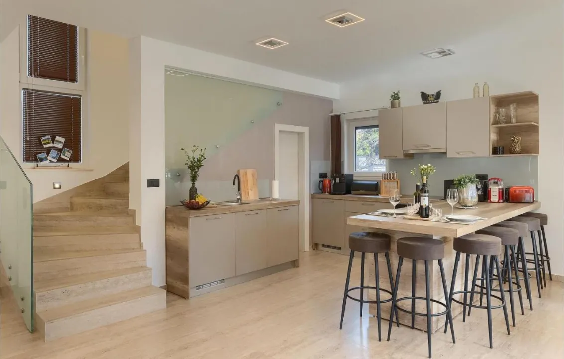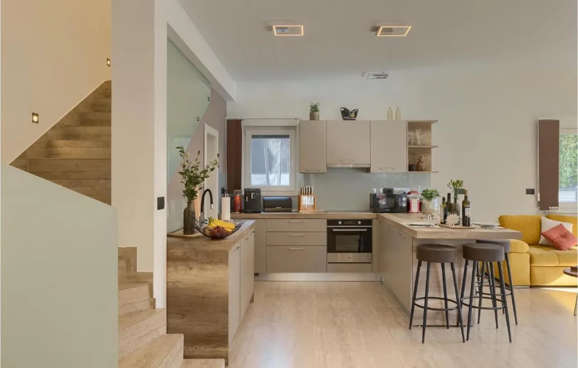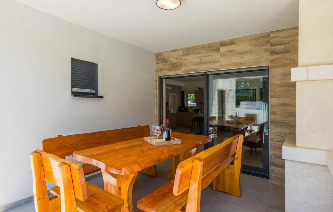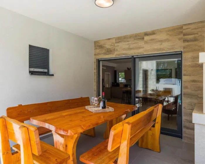 Prostrana kuća za odmor ima 3 odvojene spavaće sobe, 3 kupatila, potpuno opremljenu kuhinju sa trpezarijom i mašinom za pranje sudova, kao i dnevni boravak sa TV-om. Smještaj obuhvata kamin.