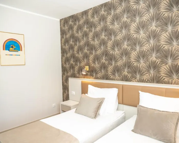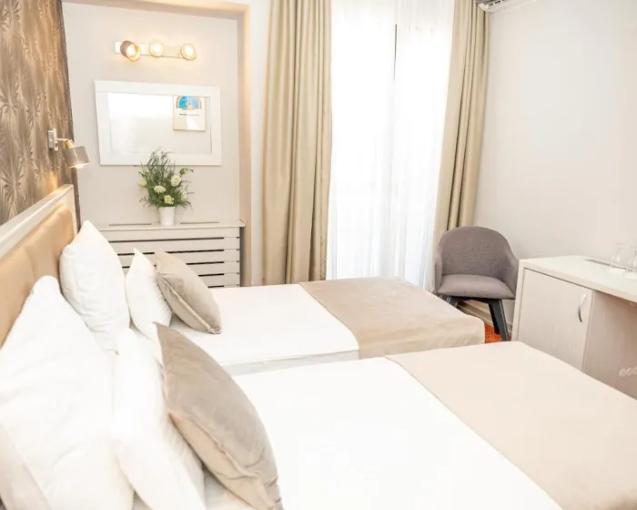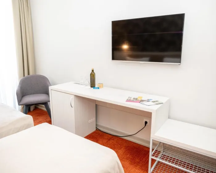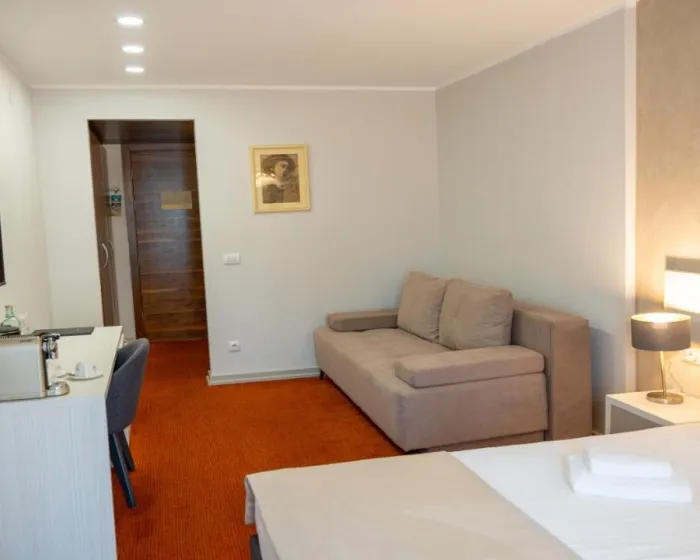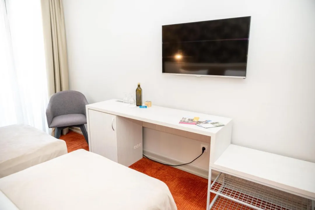 Neki gostinjske sobe su opremljene balkonom. Sadržaji u svakoj sobi obuhvataju satelitsku TV, privatno kupatilo opremljeno tušem i bideom. Sve smeštajne jedinice imaju garderober.